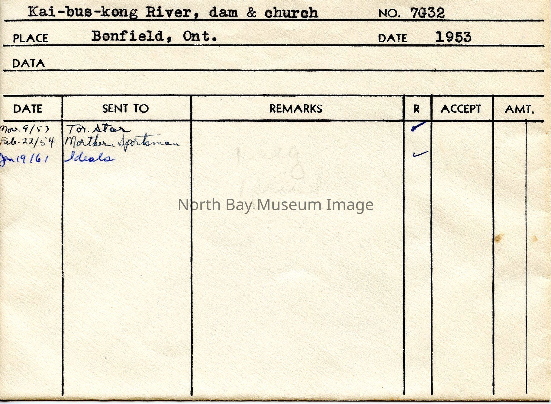 Envelope (a) containing photo and negative of Kaibuskong river with dam and church in distance in Bonfield area. Original number 7G32 by William Forder. Places published listed on envelope.Creator