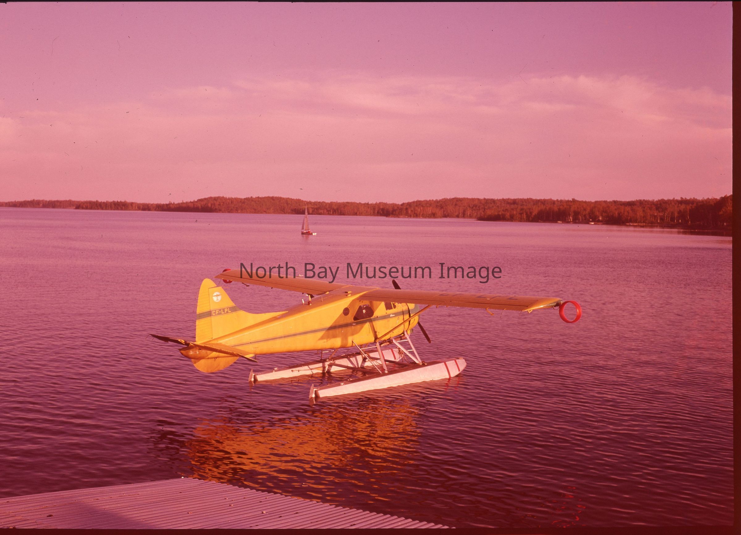 The Envelope (a) contains the slides (b-c) of an airplane at sunset on Trout Lake Road at the Marine Room. The images show a yellow and black plane on the water getting ready for take off. In the far distance you can see a small boat off in the distance. The publications are listed on the envelope. A part of the Forder Collection.Creator