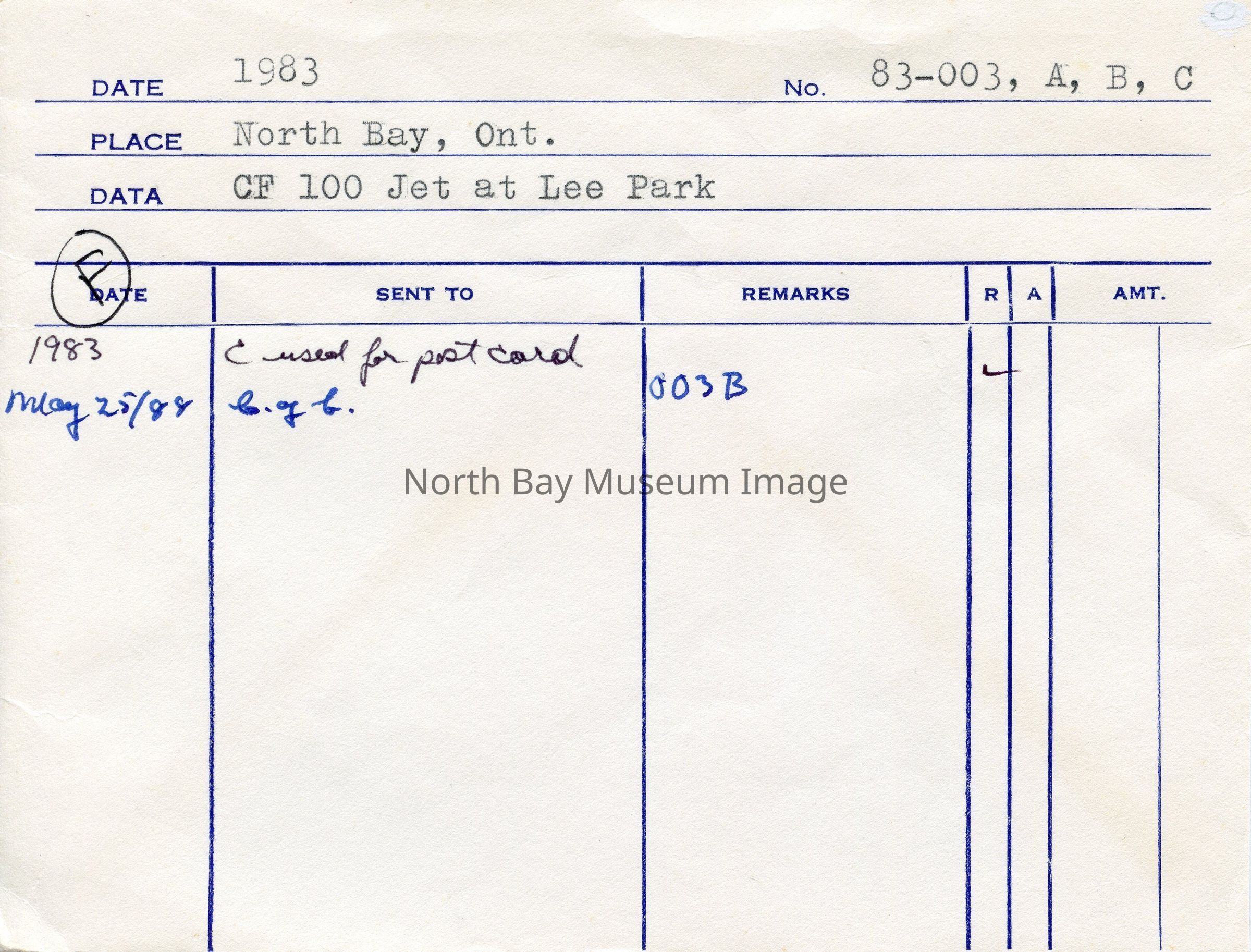 William Forder's original photographer's envelope with negative of CF-100 Jet at Lee Park. Publications listed on the envelope. Original number was 83-003.Creator
