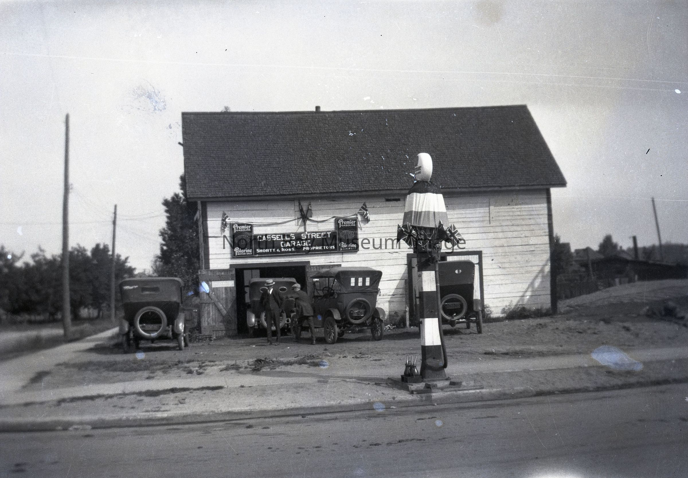 Image of Cassells Street garage. There are cars and people standing in front of garage. The garage is only a small little white building but was identified by sign in middle of photo. Part of the William Forder collection.Creator