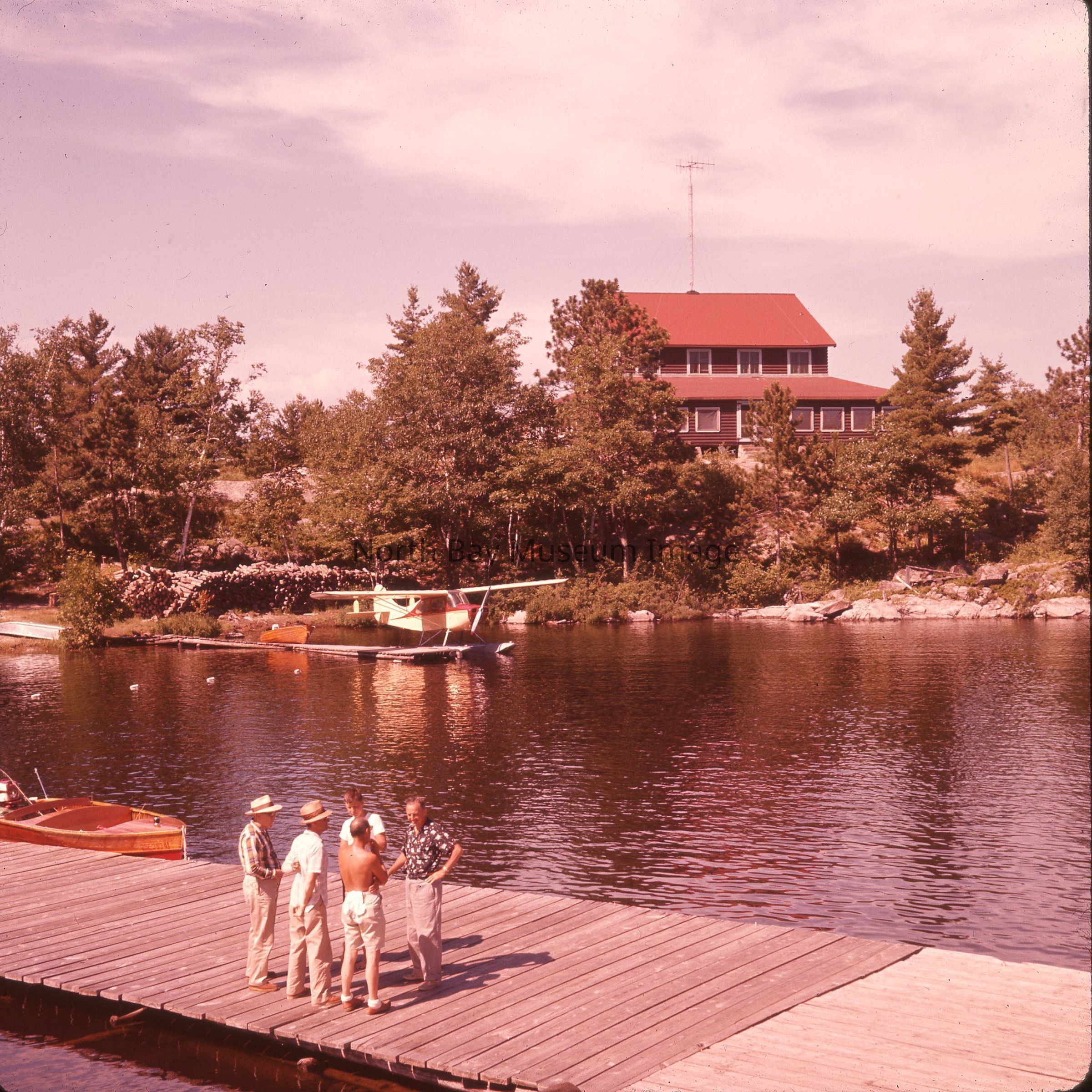 This is a photograph of dock with house and float plane in the background (possibly Trout Lake). Part of the William Forder Collection.