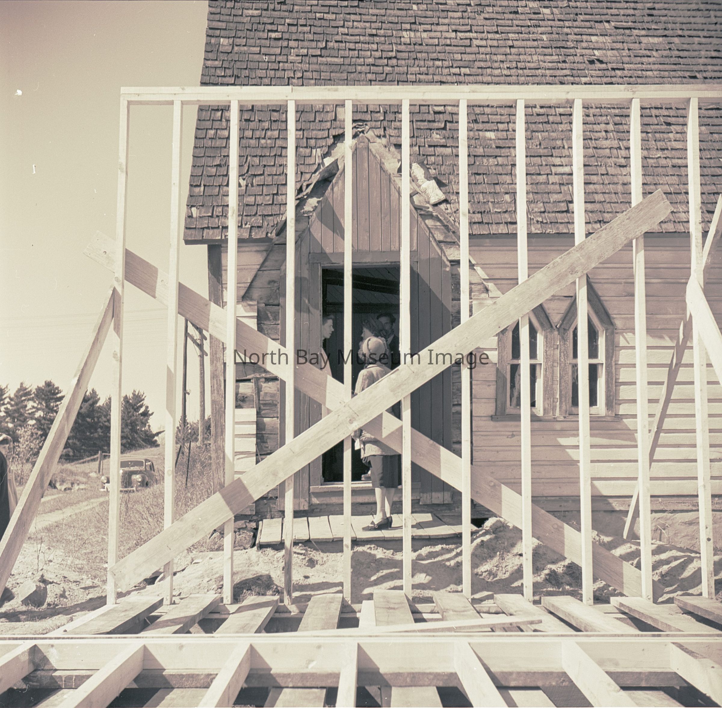 - Negative (q) taken through wall skeleton being built, shows dooor into church and people standing in it.