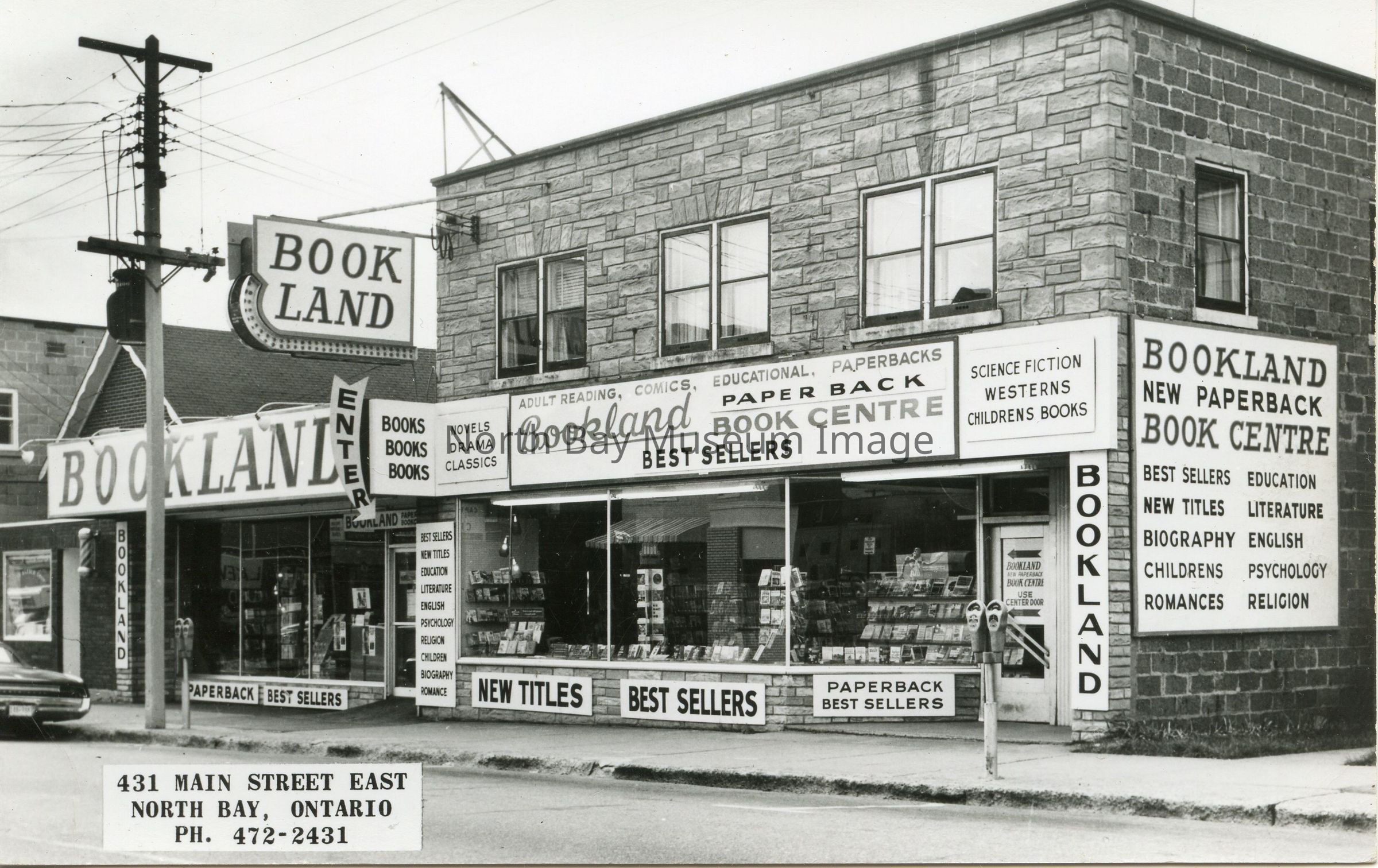 Postcard with B&W photo of Bookland Book Centre, located at 431 Main St. East, North Bay.