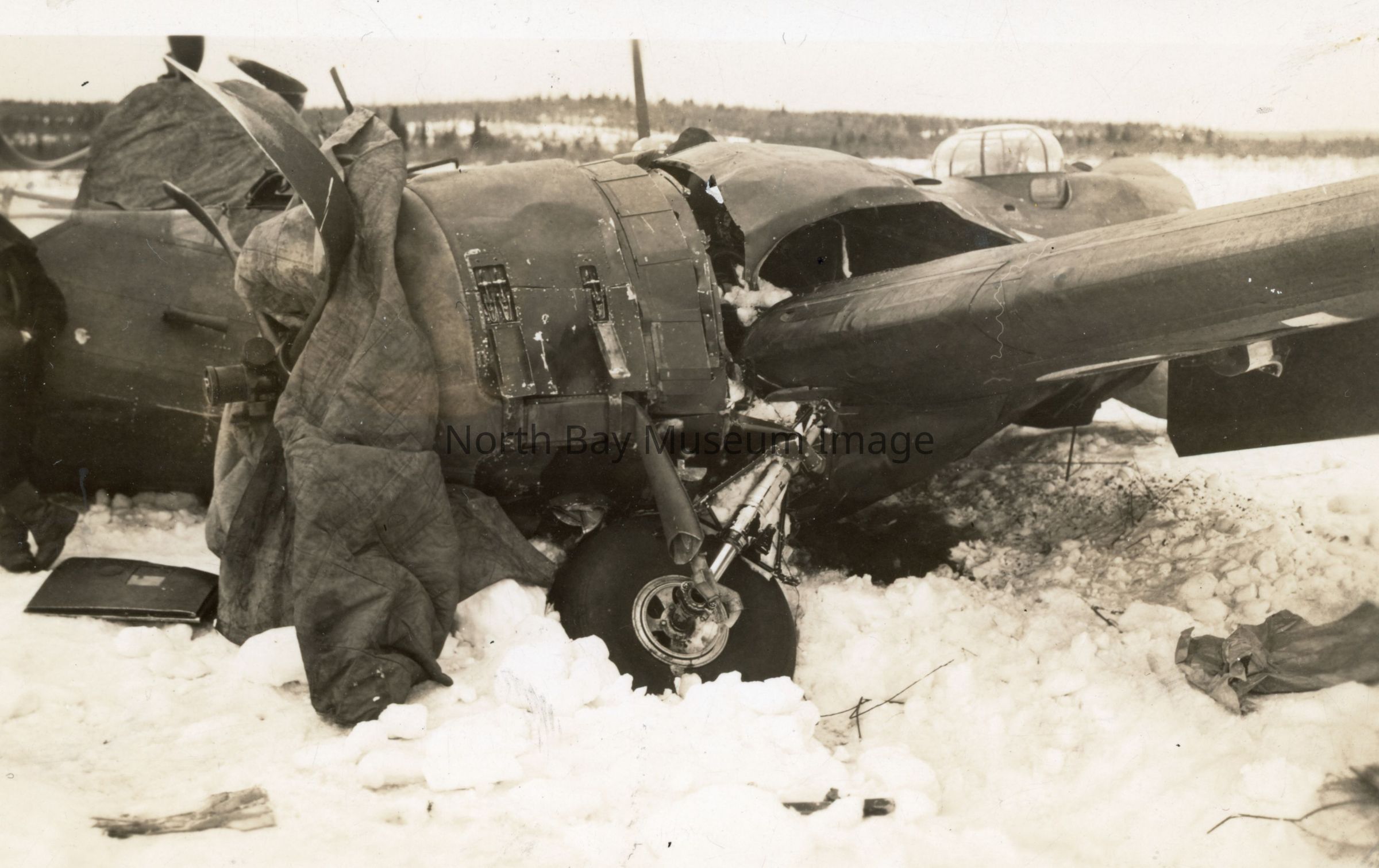 Photographs of plane crash. Bollingbroke Mk. IV s/n 9076 was being ferried by a crew from Ferry Detachment at North Bay. The detachment was part of the R.C.A.F. Station Rockcliffe-based No. 124 (Ferry) Squadron. The aircraft took off from North Bay in windy conditions on the 5th of April, 1943 and immediately experienced a starboard engine failure. The aircraft's wing dropped and the pilot was unable to recover it. The Bollingbroke struck the ground in a steepening turn at 16:07 hours. Neither crew member was injured. The aircraft sustained Category 'A' damage and subsequently written off. The crew included Pilot - Pilot Officer S. L. Everett. And Crewman - LAC W. E. Corbett. (a-b) show the wreckage from two different angles: one close up and one farther back. Note that there is snow on the ground.Creator