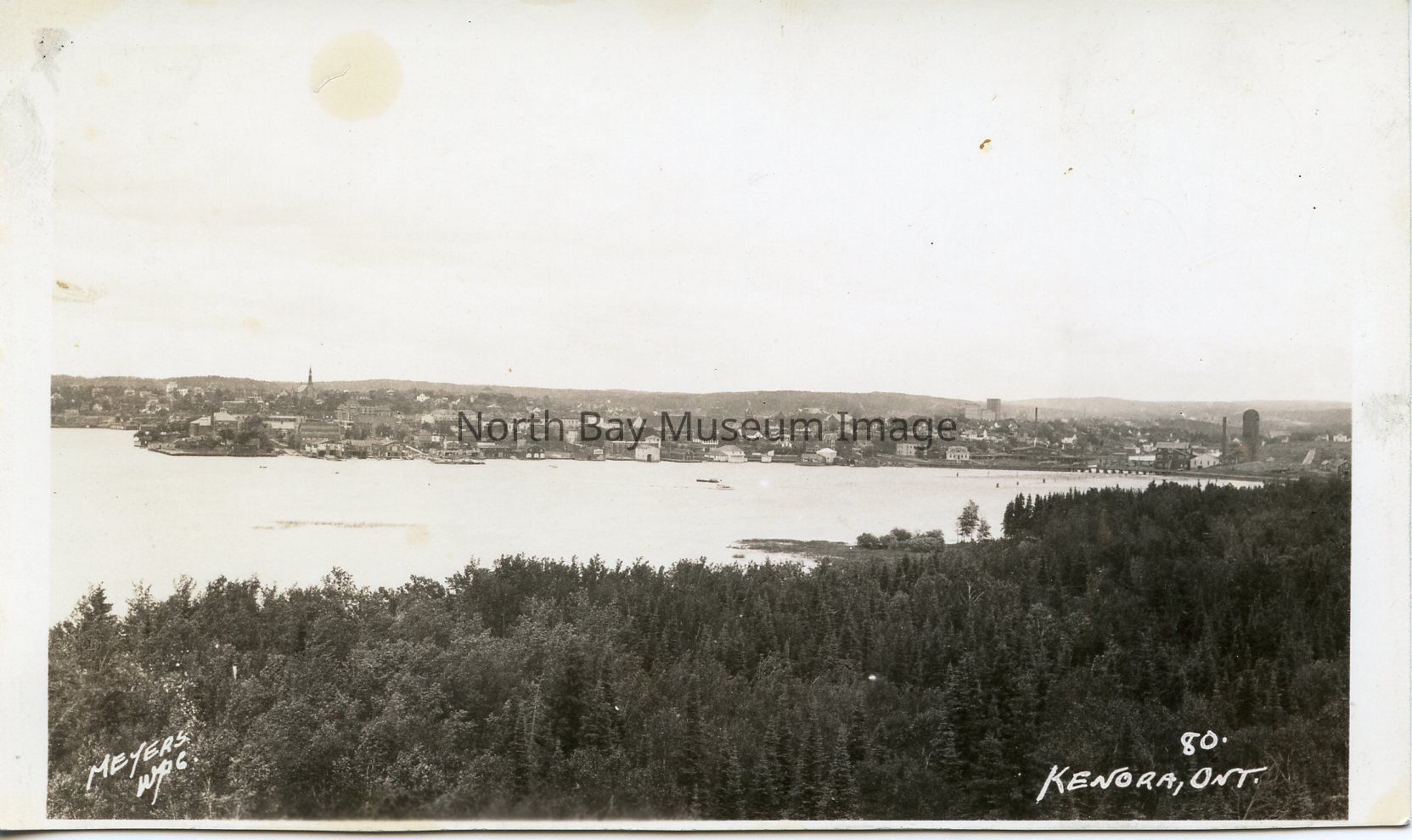 This black and white postcard shows a landscape view of Kenora, Ont in the 1980s. In the bottom of the postcard you can see a forestscape. In the middle of the image you can see the lake in Kenora, and at the top the cityscape can be seen. This image is taken looking down at the forest, lake, and city of Kenora.