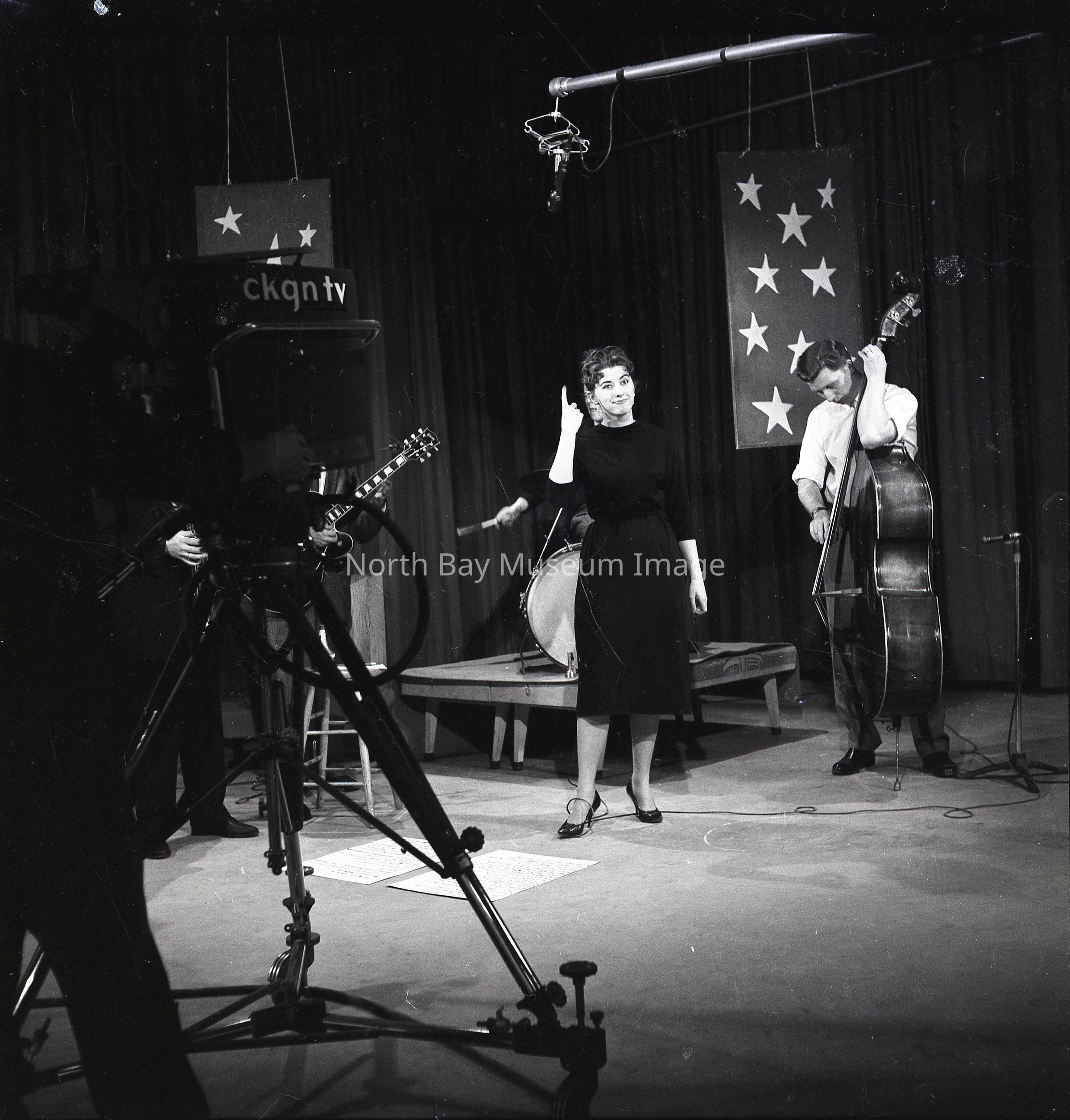 Two negatives of CKGN television studio with dancing and musicians playing.