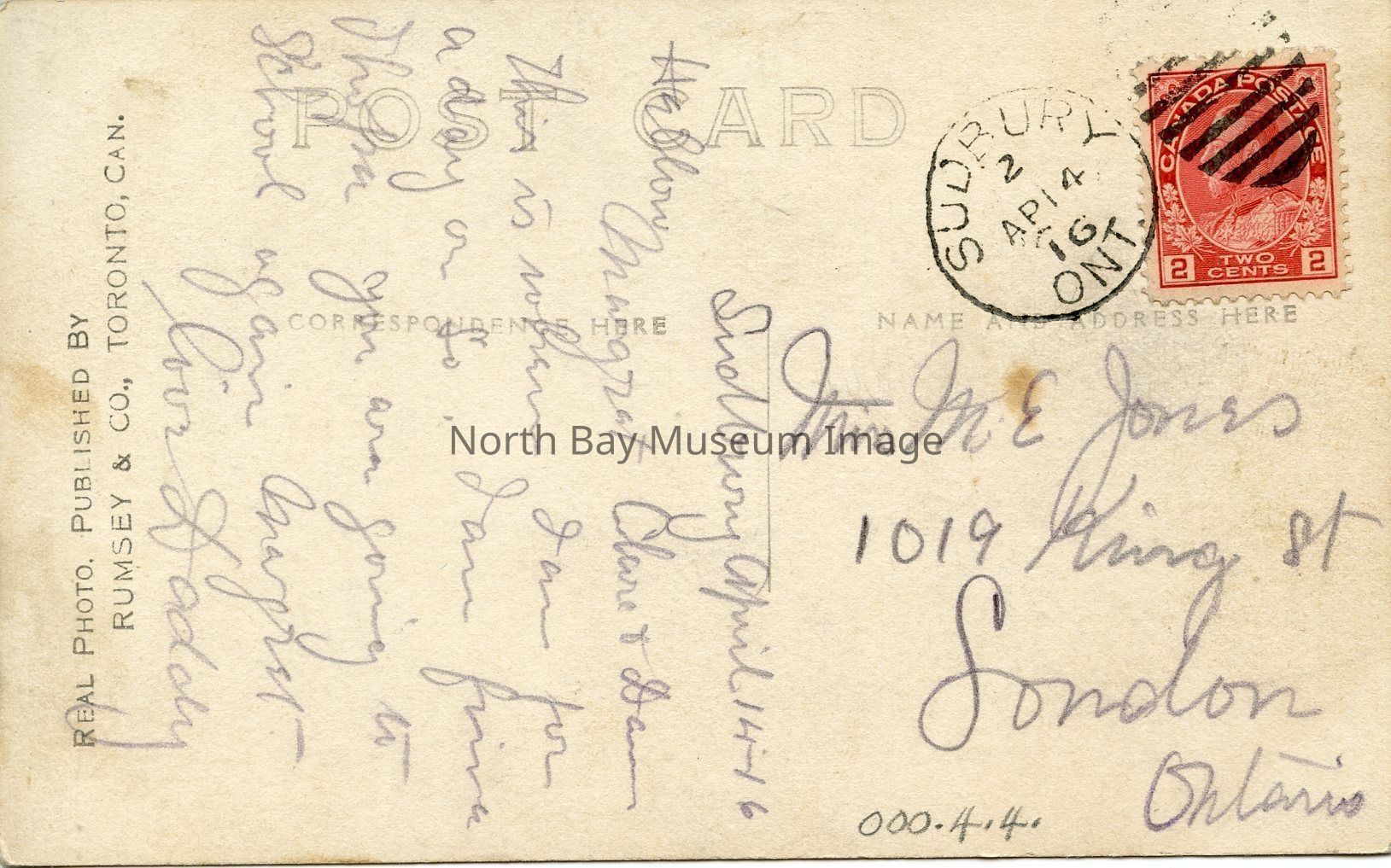 This postcard is post marked "Sudbury Ont. 2, Apr. 14-16." the back of postcard has a red 2cent stamp on it, cancelled with black lines going through it. the card is sent to Mr. & Mrs. E. Jones 1019 King St. London, Ont. & Margret from Daddy.Creator