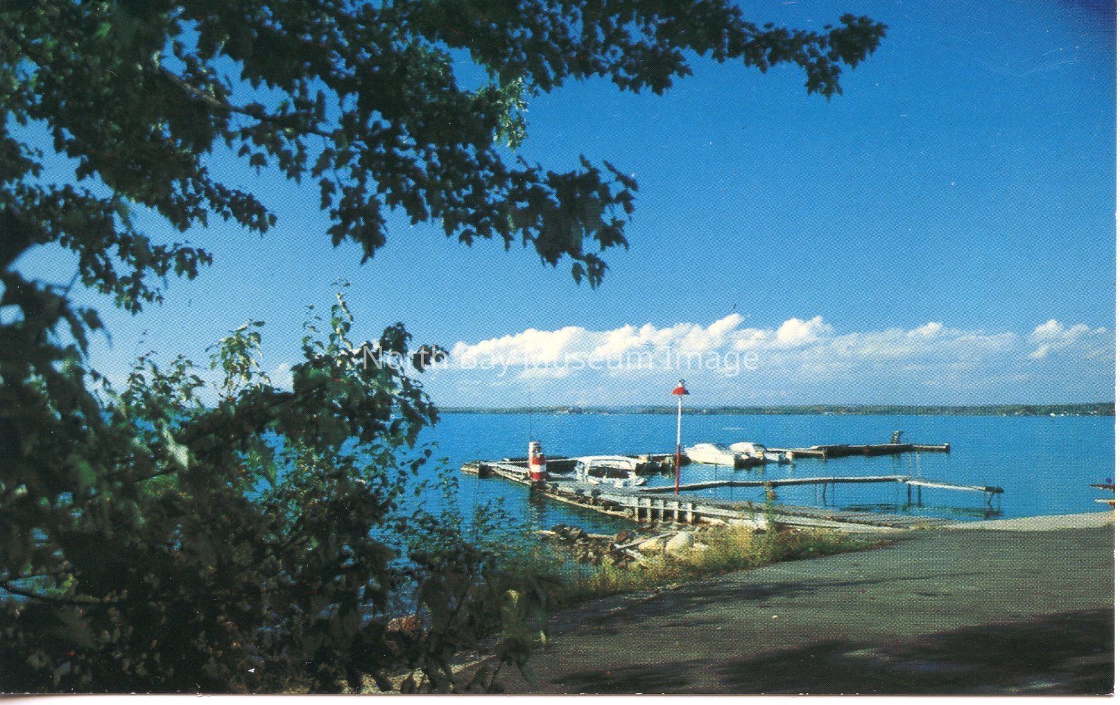 This is a colourful postcard of Lake Nipissing, Ont. The image shows a lake in the background with a small dock. The dock has a a few small boats tied to it. The photo appears to be taken from farther back looking at the lake. Beside where the photograph is being taken there are a collection of large shady trees.