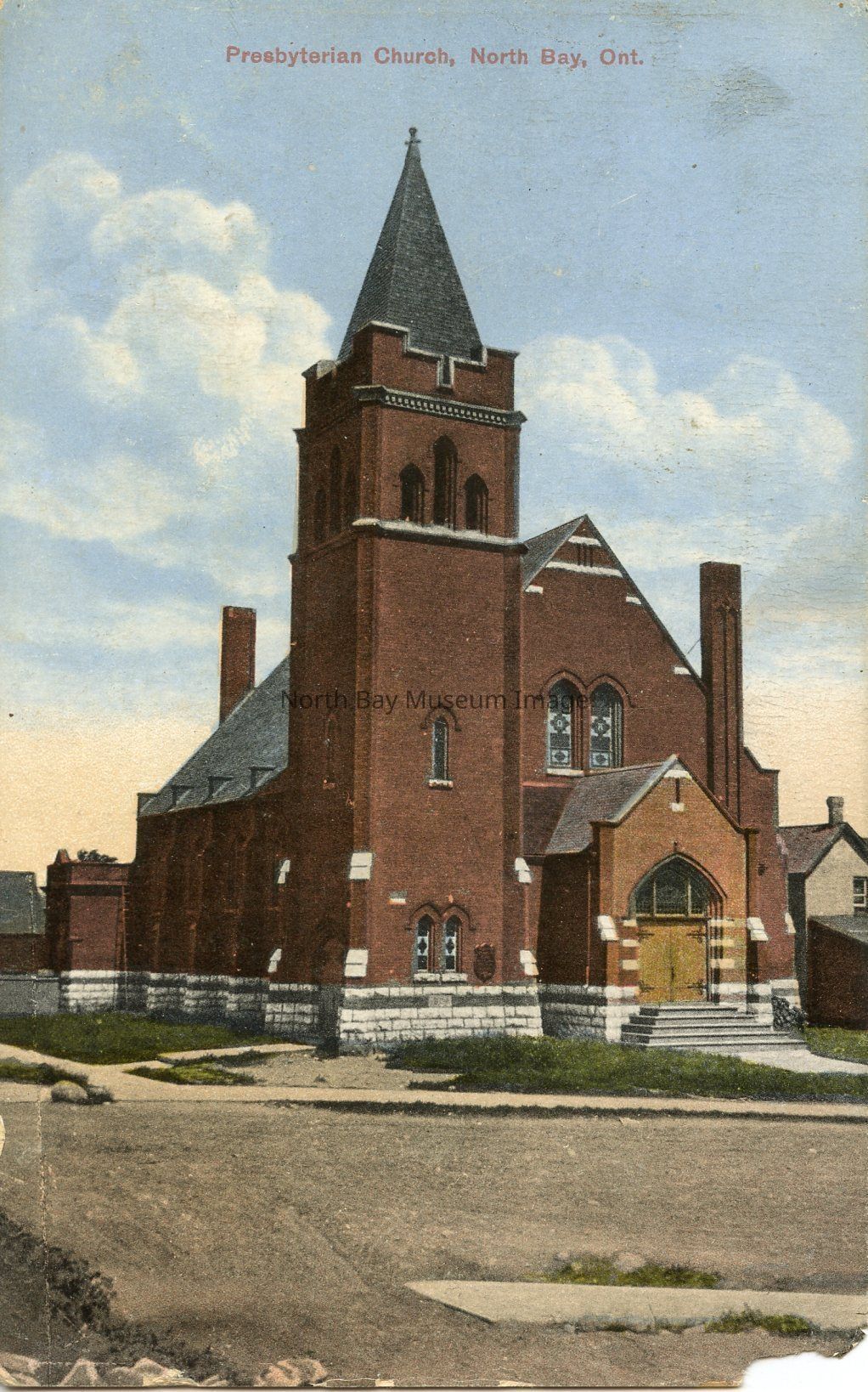 This is a Coloured postcard of the Presbyterian Church in North Bay, Ontario. The building is a red brick building with a black roof. The image is taken far back looking at the grandness of the church. There is a unpaved road in front of the church. There is four steps to go into the church. The church door is a beige wooden door.