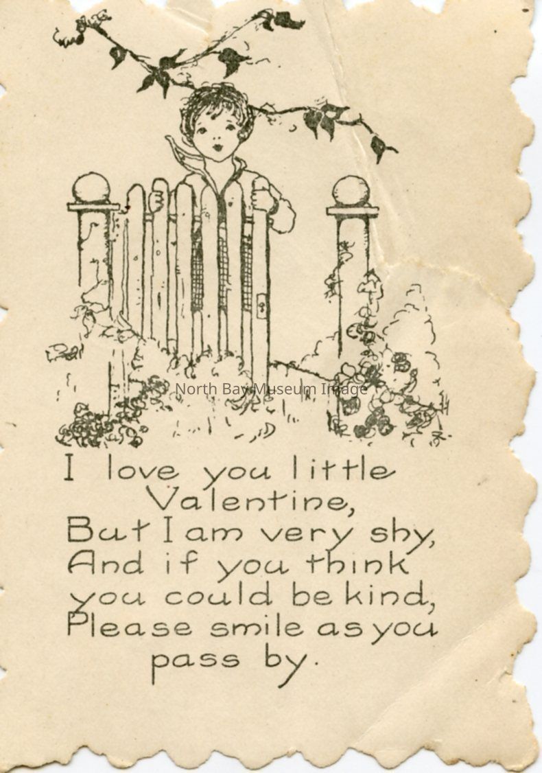 On the inside the card's inscription says "I love you..smile as you pass by." There also is an illustrated image of a small child standing by a fence. There are bushes and plants in front of the fence.