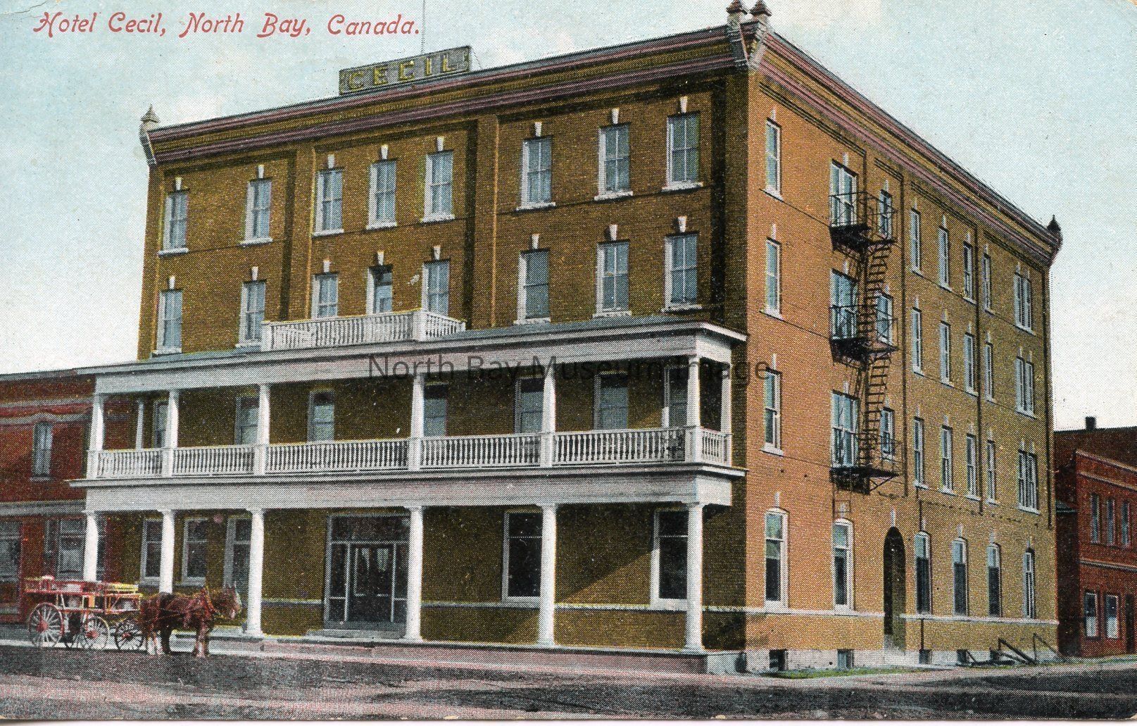 Colored post card of Hotel CECIL, North Bay ( Now Continental). The hotel is a four storey brown building. On the right hand corner there is a horse and wagon. The front of the hotel has white collums and a white balcony.