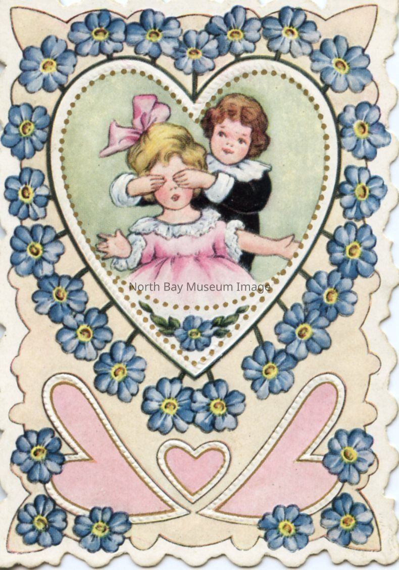 A Valentine card, 3.75 inch x 2.5 inch. The front of the card has little drawings of blue and pink flowers surrounding an image of a little boy covering the eyes of a little girl.