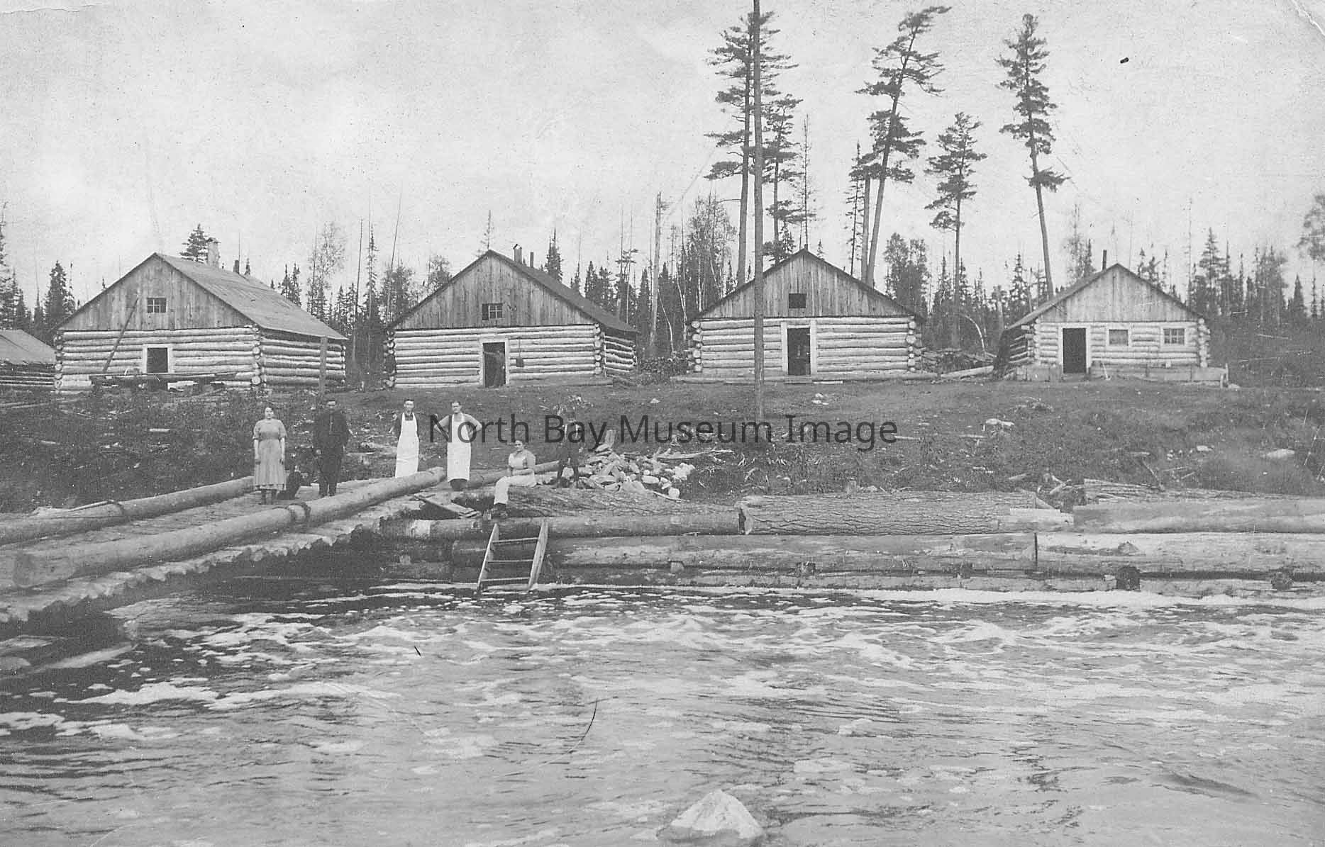 There are 5 log buildings in the background and 6 individuals standing on the shoreline in front of the camp