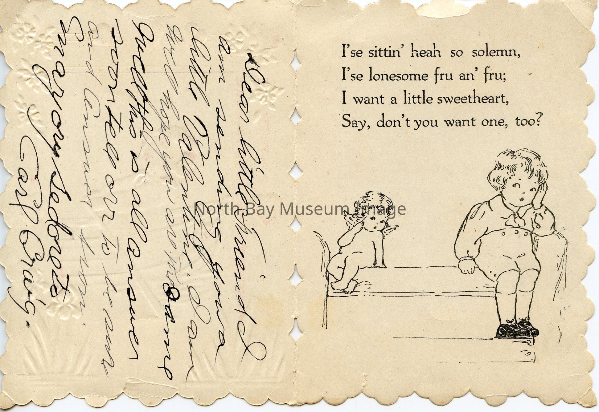 A Valentines Day card that is 4.5 inch x 3 inch. The front of the card has an image of a little child rowing a row boat. The boarder of the card is brown with small illustrations of flowers on it. The inside of the card has an illustration of a shy boy and girl looking at each other. They are both sitting on a bench. The inscription inside the card says "I'se sittin heah so solemn, I'se lonesome fur an' fru, I want a little sweetheart say don't you want one to." There is also a, personal note written in left side. This card is Whitney Made, Worchester Mass.