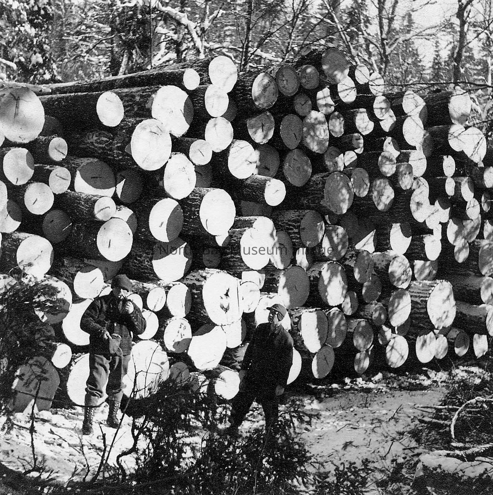 Black and white photographic print of John B. Smith & Sons Ltd. lumberjacks working the timber limits and preparing the logs for the spring run. Small white border frames the image.