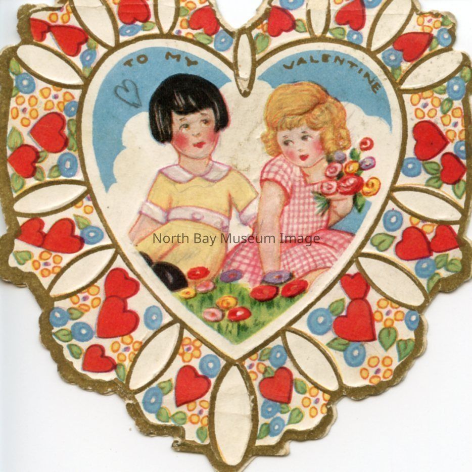 1 brown heart-shaped Valentine's Day card, approx. 3 inch x 3 inch, from Annie C. Whitney Made, Worcester Mass., made in U.S.A. The front of the card is colourful and says 'To My Valentine.' It also has an image of a little girl and boy in the center.