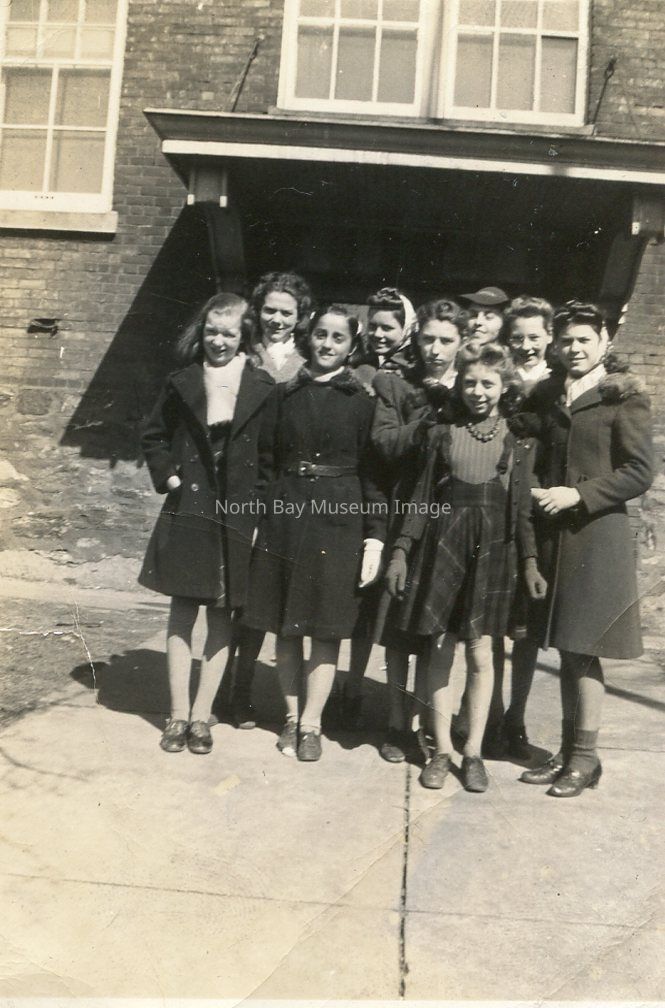 Snapshot of group of girls at McIntyre Street School (King Edward School). On back of photo is written no. E03 and names including 1(L) to 9(R) known (3) Margaret Kelly (5) Steele (6) Doreen Burs (7) Shirley Mison (8) Patsy Brown.