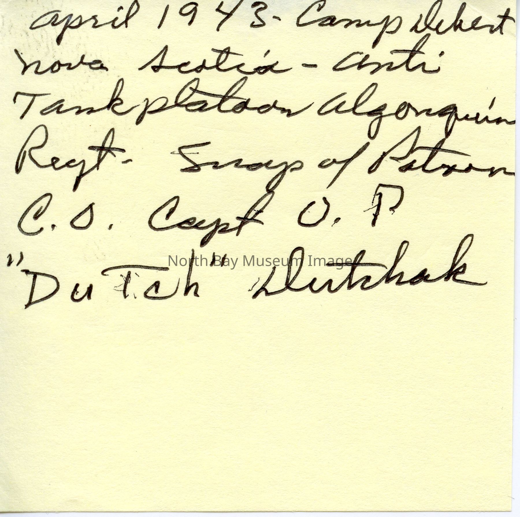 021.31.06b - Sticky note. "April 1943 - Camp Debert Nova Scotia - Anti-Tank platoon Algonquin Regt. Snap of Platoon C.O. Capt O. P 'Dutch'...".