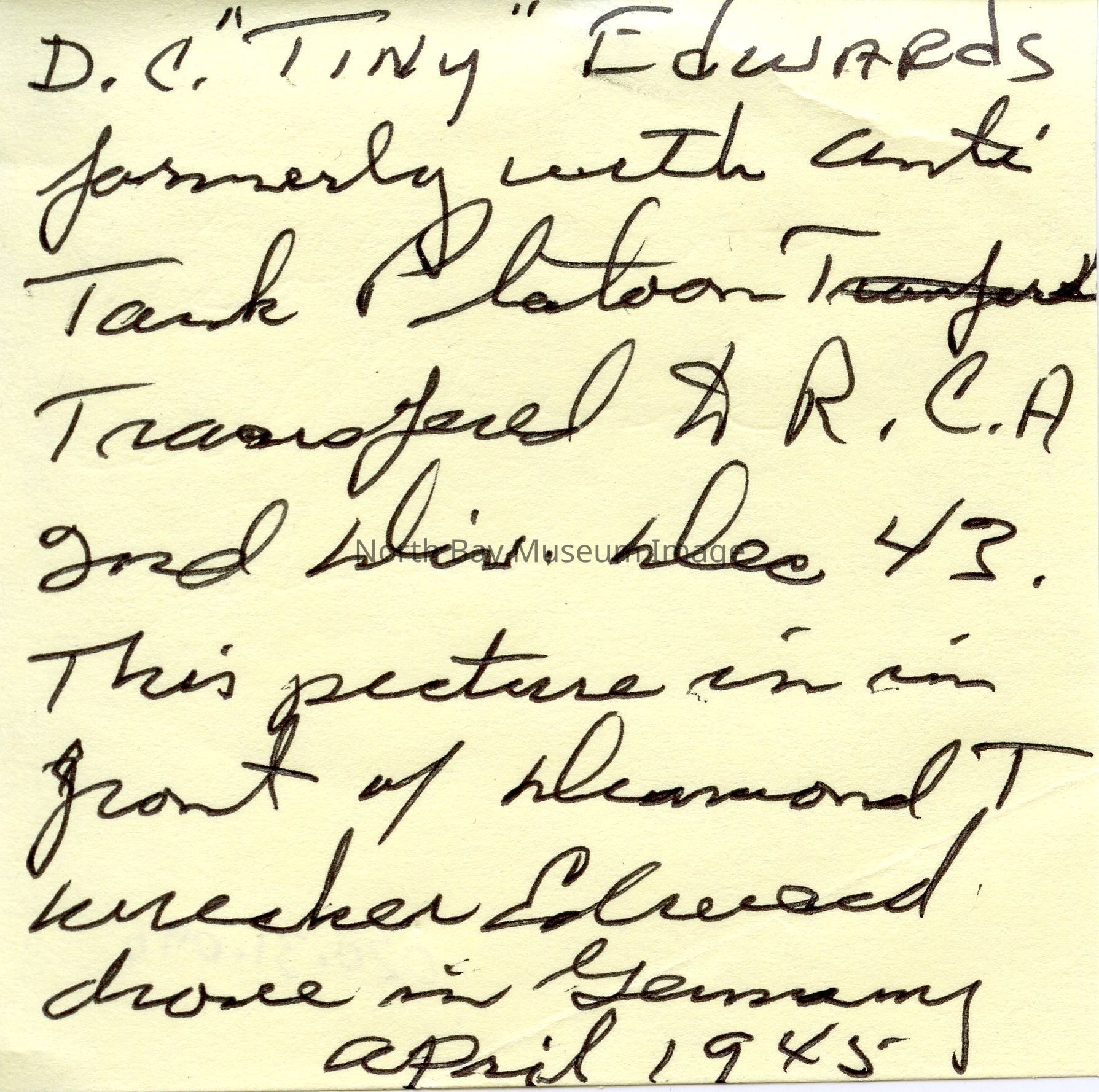 021.31.09a - Sticky note. "D.C. 'Tiny' Edwards formerly with Anti Tank Platoon Transfered to R. C.A 2nd ... Dec 43. This picture is in front of Diamond T wrecker Edward drove in Germany April 1945."