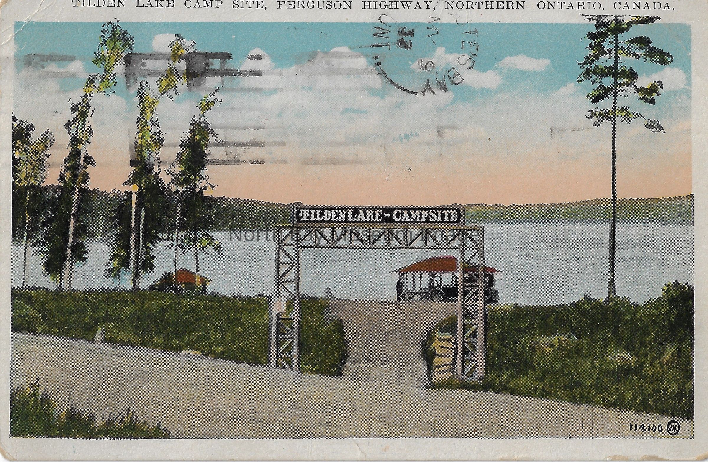 This is a coloured, painted postcard. The card is of a sign saying "Tilden Lake Camp Site." There is a dirt path in front of the sign. In the background are two small camp buildings as well as a lake. The postcard also depicts a sunset. The title of the postcard is: "Tilden Lake Camp Site, Ferguson Highway, Northern Ontario, Canada.". Inscription on back: "Hello everybody, Arrived in North Bay Bay and Mac is with us now and is going to try out with us, hoping to hear from you all soon. Love, Bill & Mrs. ... North Bay. Mr. J. B... Footes Bay Ont. Muskoka".