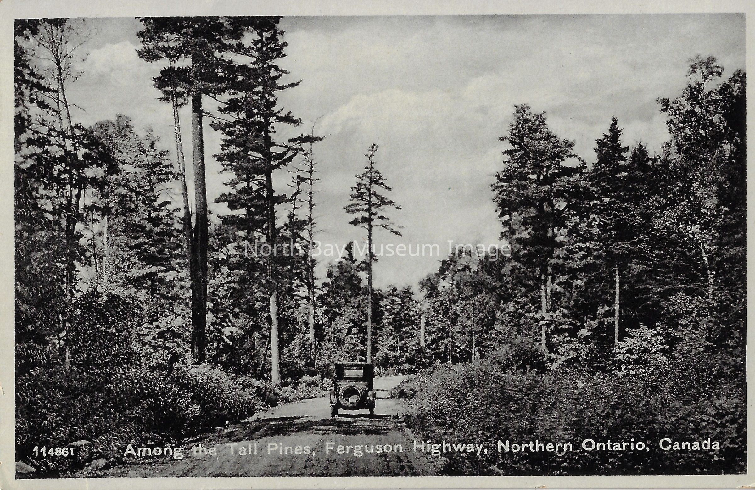 This is a black and white postcard. The postcard is of a dirt road with a car driving down the road. The road appears to be in the middle of a forested area. The title of the postcard is: "Among the Tall Pines, Ferguson Highway, Northern Ontario, Canada".Date(s) of Creation