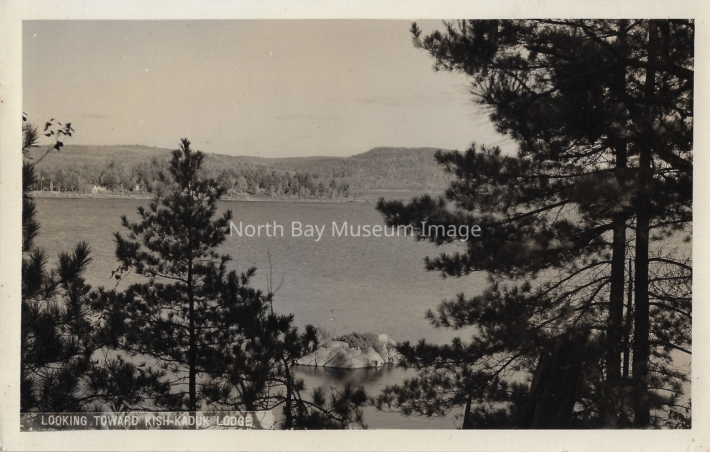 Black and white postcard. The postcard is a landscape shot. The photo was taken through trees looking out at a body of water. In the body of water and right in the focus of the photo is a small rock island. The inscriptions on the postcard reads "Monday", "Dear Margaret, - This is one of Jack's Picture taken from the little island where we had the heart to heat talk last summer. It seems more beautiful than ever here--if possible. Everyone of the family hopes to see you on deck and awaits your arrival with keen anticipation! Please bring a flashlight if you have one. I shall have the band at the station Sunday A.M.", "Miss Margaret McCulloch National Museum Library Ottawa . Aug 13 1940."
