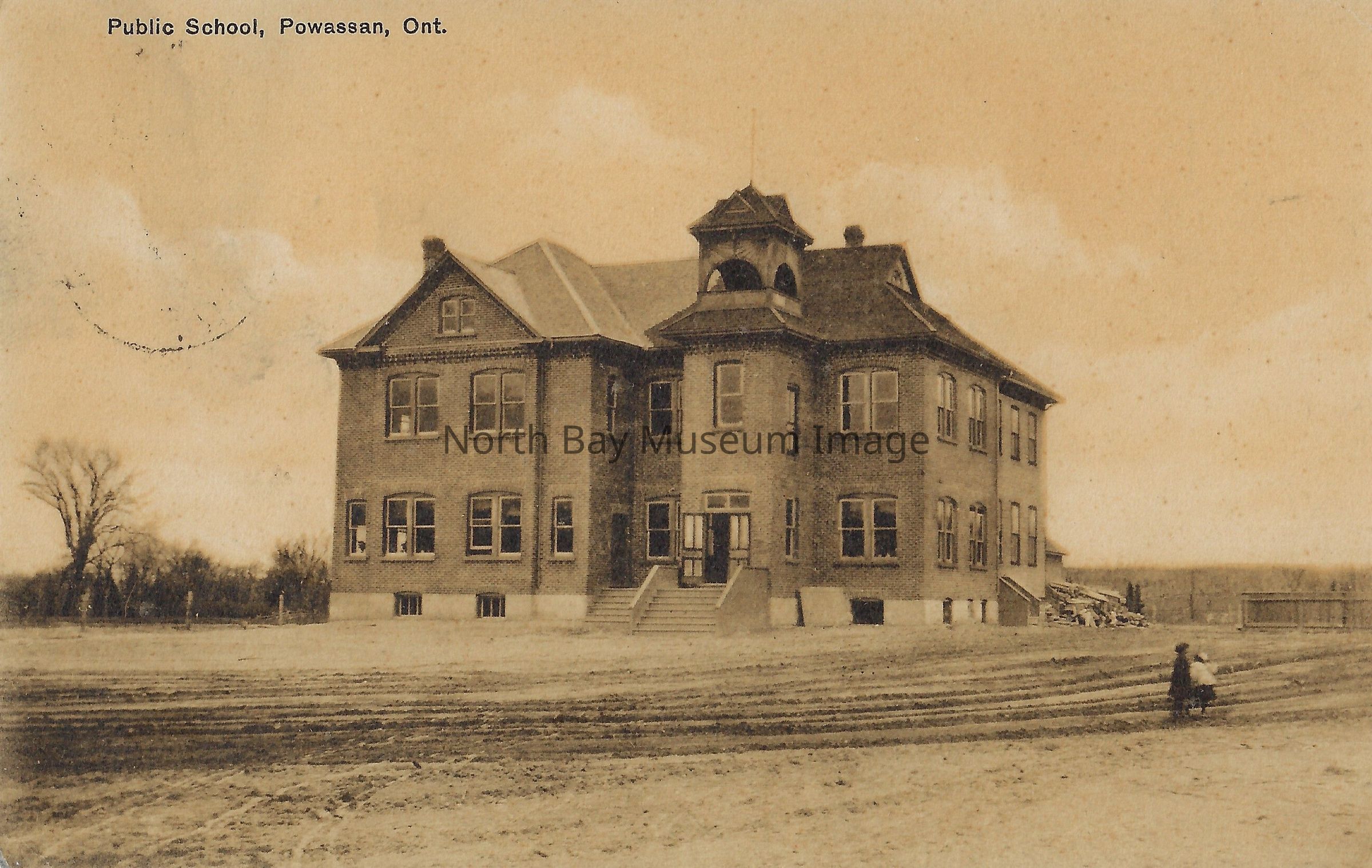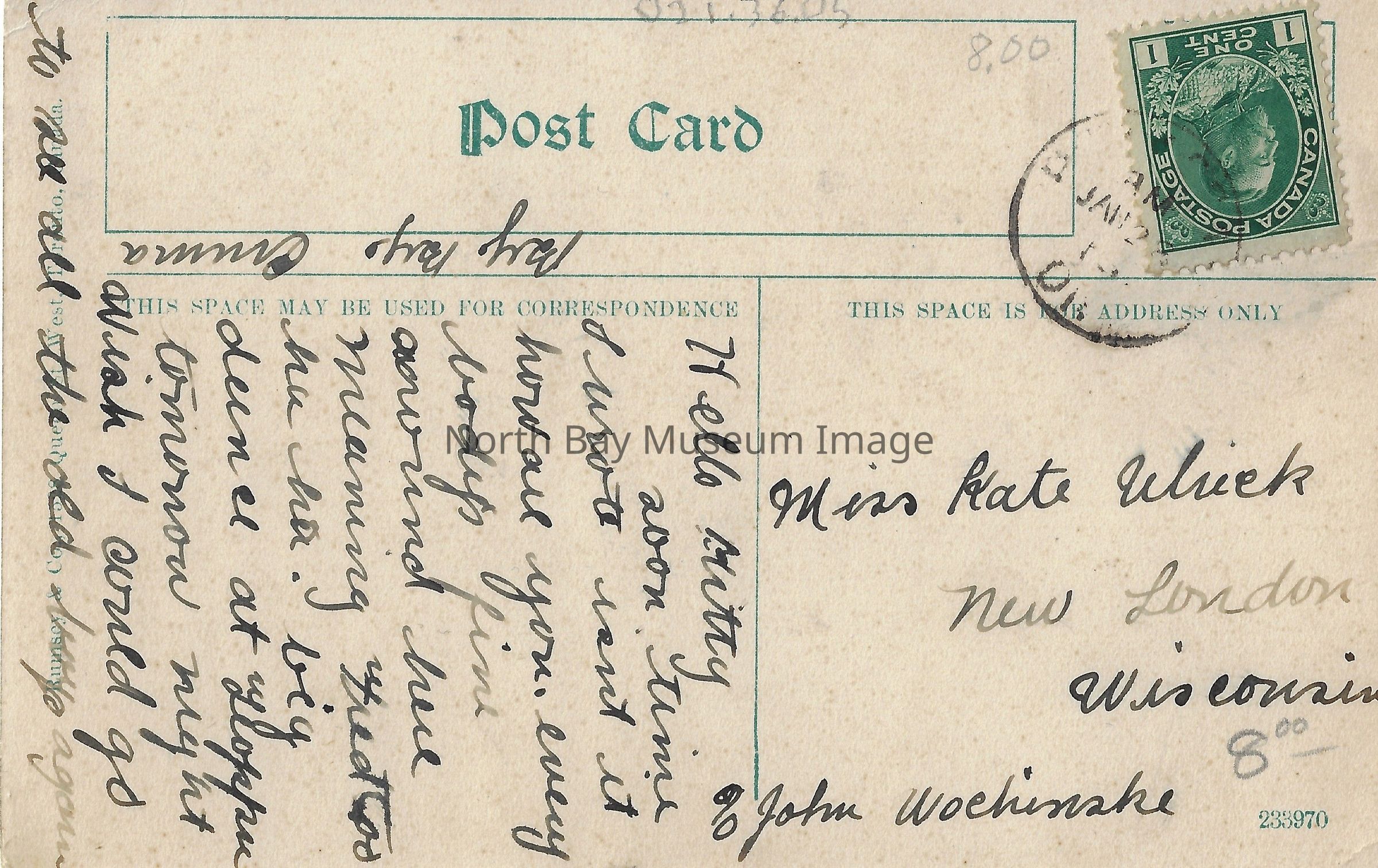 This postcard is entitled "Public School, Powassan, Ont." The postcard is black and white image of a public school building with people standing in front. The school appears to be a two storey school building. There are large windows lining the school building. There is also large stairs leading to the front door of the school building. There is an inscription on back stating: "Hello Kitty, been time I wrote isnt it how are you every bodys fine around here meaning... tomorrow night wish I could go ato see all the old boys again", "Miss Kate Ulrick New London Wisconsin John Wochinske", "Bye Bye Emma", "... JAN 28...". There is a green one cent postage stamp. There is also a black post mark from the post office.Date(s) of Creation