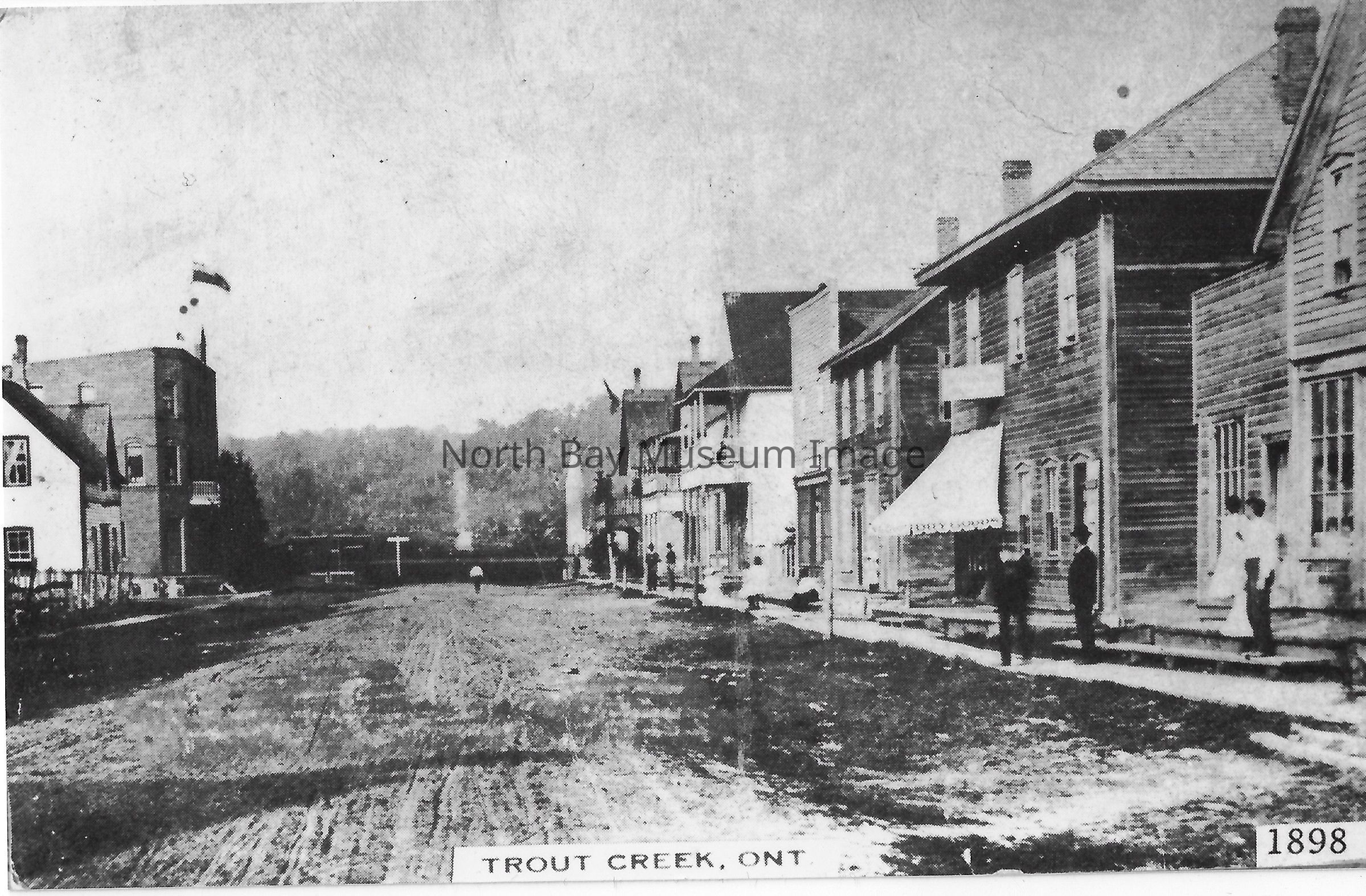 This black and white postcard is of a Trout Creek streetscape. The street is lined with homes. The road appears to be an unpaved, dirt road. There are two men walking on the right hand side of the street on a paved sidewalk. In the background appears to be a wooded area. The caption at the bottom of the postcard reads "Trout Creek."Date(s) of Creation