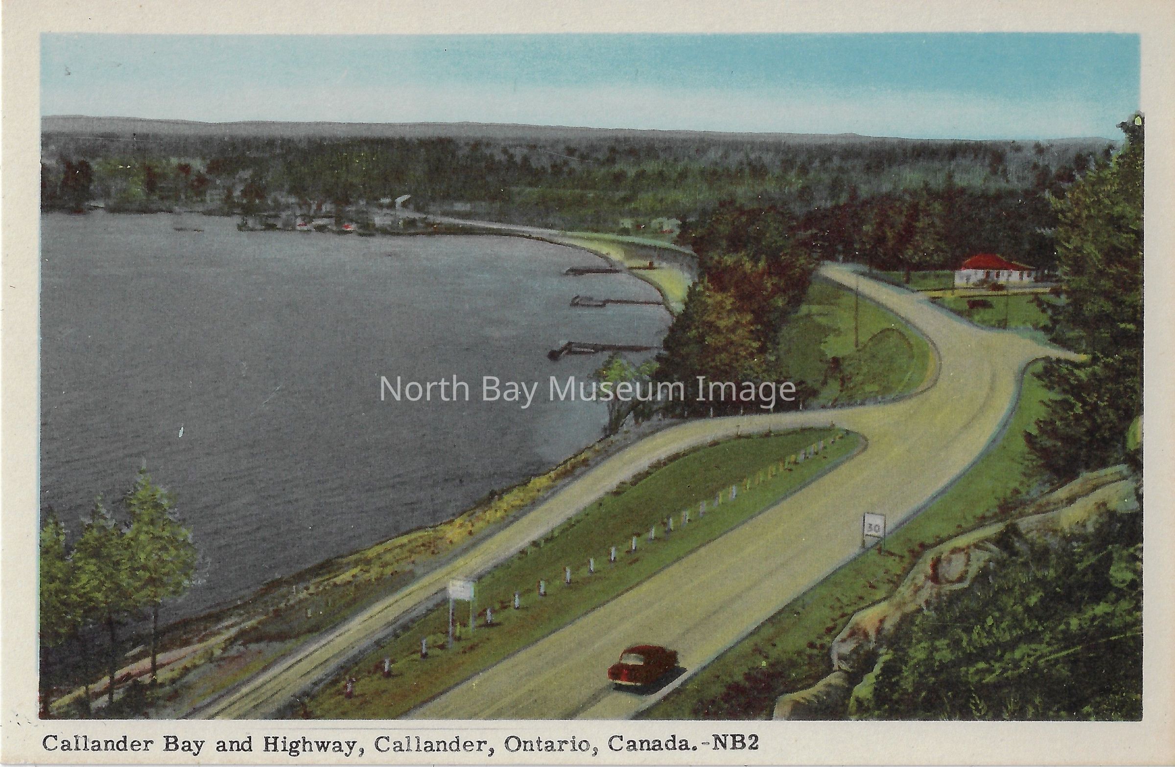 This is a colour, painted postcard. The postcard image is taken from above looking down at the Callander Bay Highway in the left hand side of the card. The Lake can also be seen in the background. The town of Callander is also visible in the background. "Callander Bay and Highway, Callender, Ontario, Canada.-NB2."Date(s) of Creation