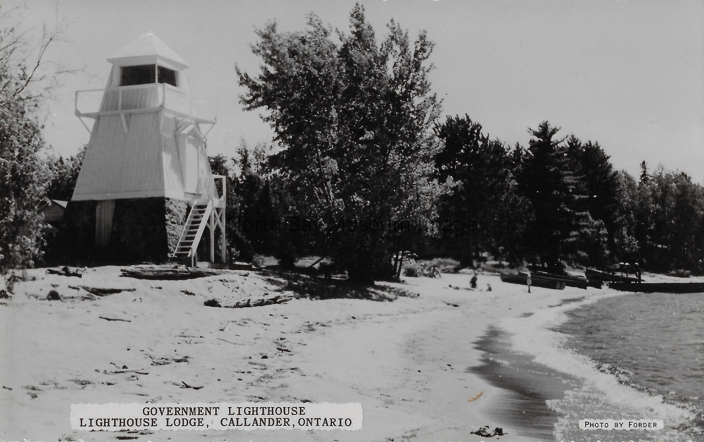 This is a black and white postcard. The card depcits a small lighthouse along the beach at Callander. The beach appears to be lined with trees and vegetation. Canoes can be seen in the right hand corner of the beach. The caption of the postcard is "Government Lighthouse Lighthouse Lodge, Callander, Ontario", "Photo By Forder".Date(s) of Creation