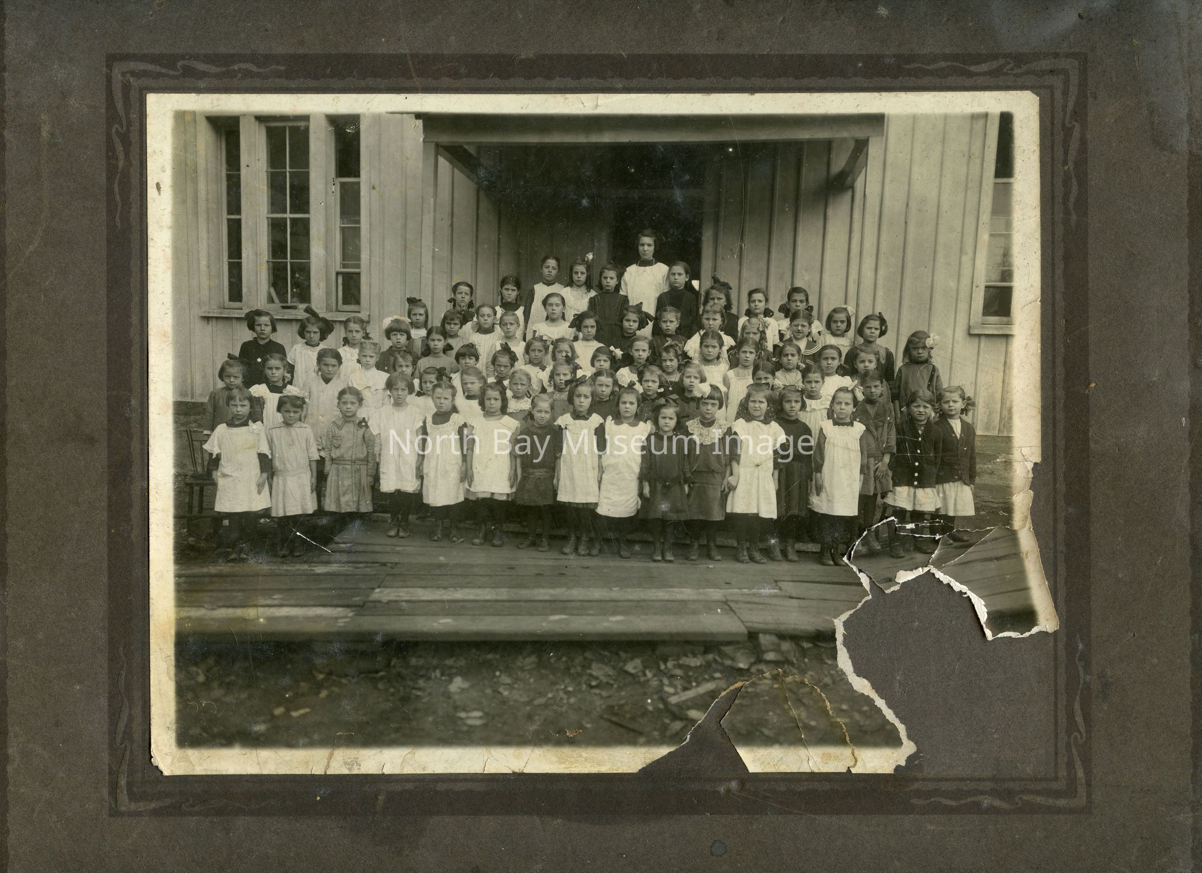 Black and white photographic print of Unidentified School Class This is a grade school group with 73 children and a teacher gathered on front step of school