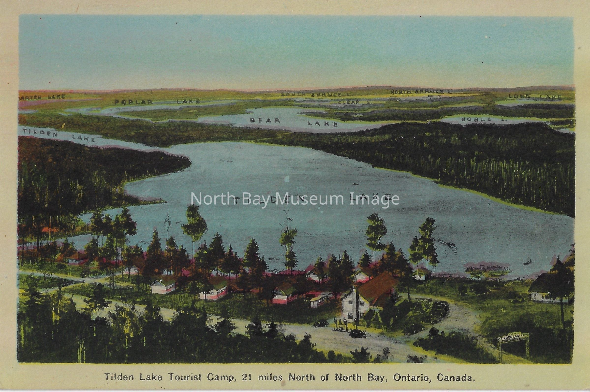 Colour, painted postcard. "Tilden Lake Tourist Camp, 21 miles North of North Bay, Ontario, Canada".The postcard shows an aerial image of the various lakes. The Various lakes shown/labelled, include "Tilden Lake", "Noble L.", "Bear Lake", "Poplar Lake", "Marten Lake", "Clear L.", "South Spruce L.", "North Spruce L.", "Long Lake".Date(s) of Creation