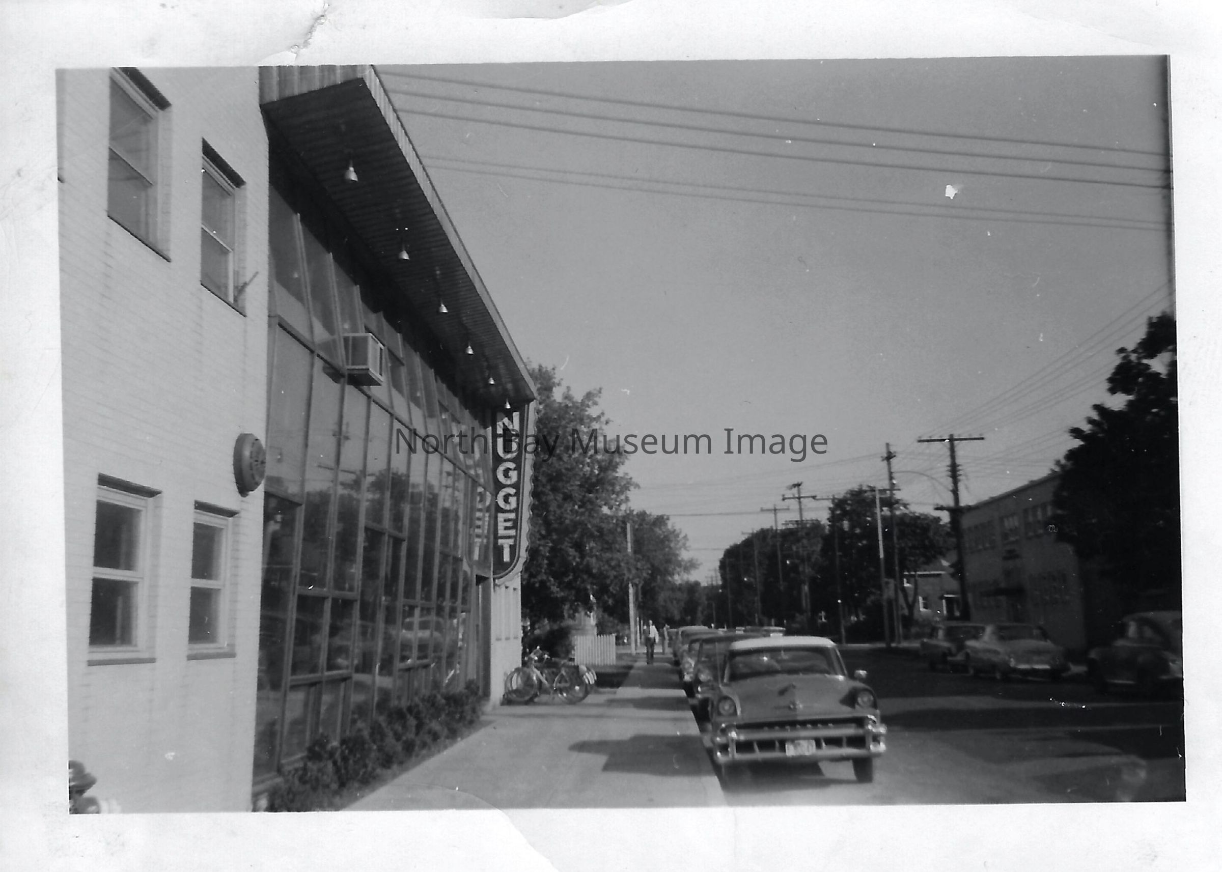 021.40.46a: Photo. Exterior of North Bay Nugget office looking down street. 021.40.46b: Photo. Inscription: "Lorne Moon & Theresa Cahill; Nugget".