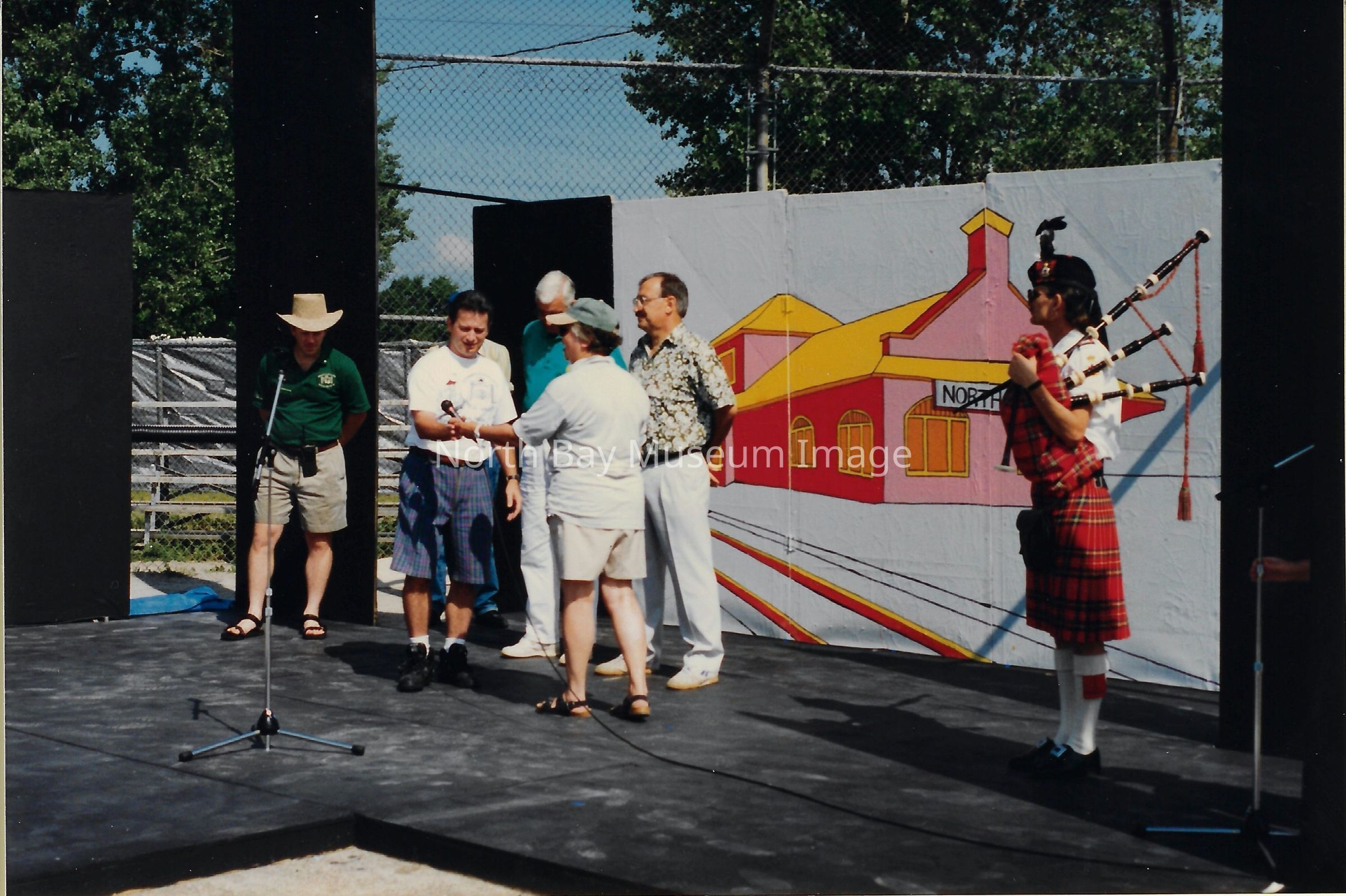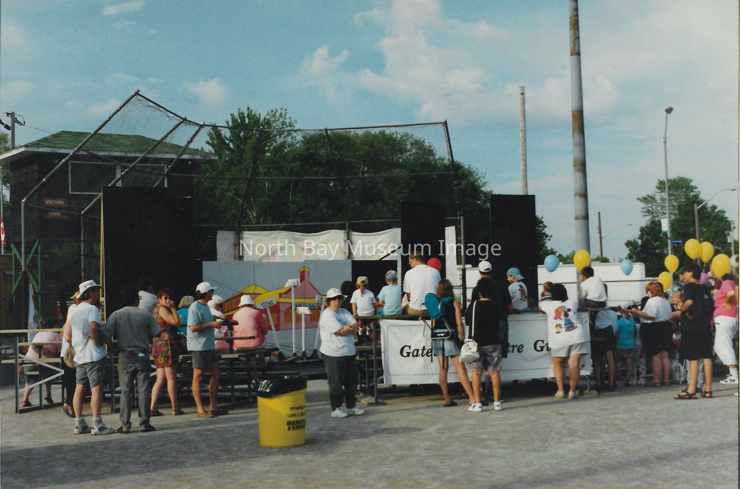 021.40.49j: Photo. Crowd gathered at baseball diamond to watch Gateway Theatre Guild play. Inscription: "GTC- Putting on Play about North Bay".