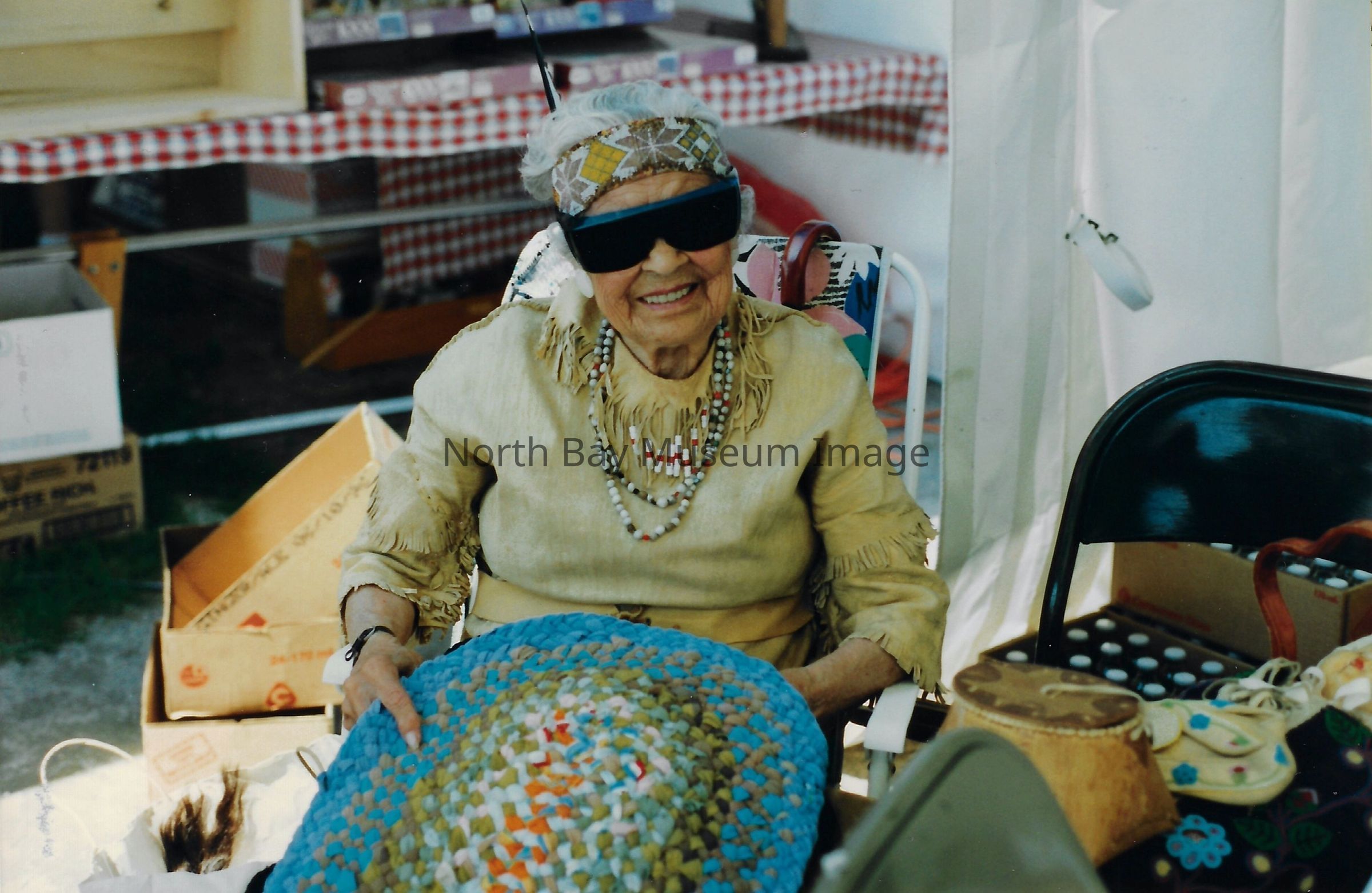 021.40.49l: Photo of woman with rug. Inscription: "Madelaine Thereault died 2000 "Moose to Moccassin""