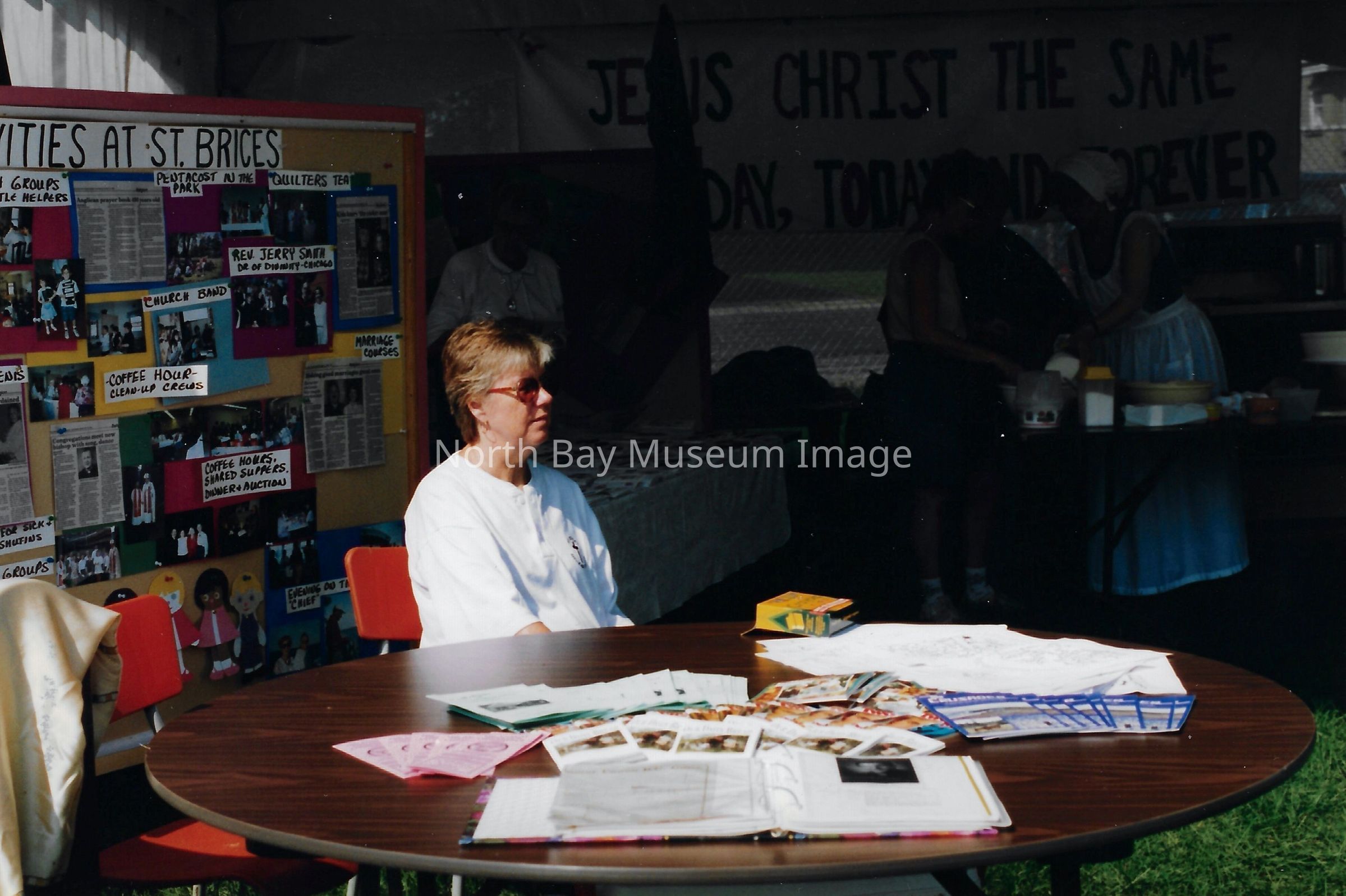 021.40.49m: Photo of woman at table in front of bulletin board that reads "Activities at St Brice's". Inscription: "Aase Jensen-St Brice's".
