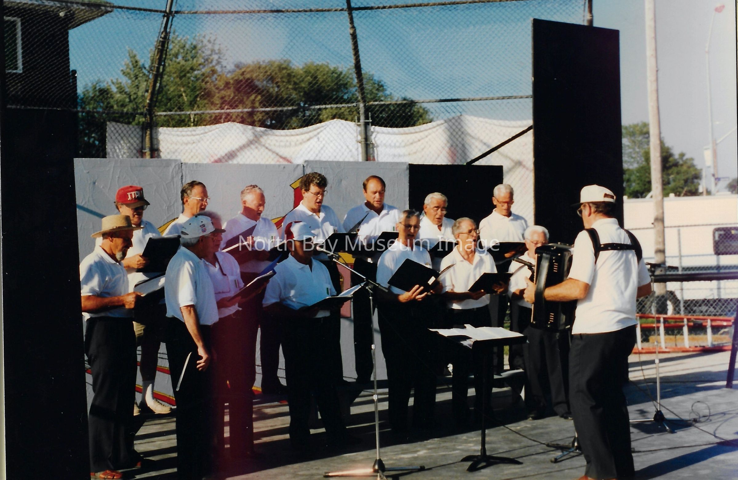 021.40.49p: Photo of men's choir singing in front of baseball diamond. Inscription: "Men's choir from Davidi Club".Date(s) of Creation