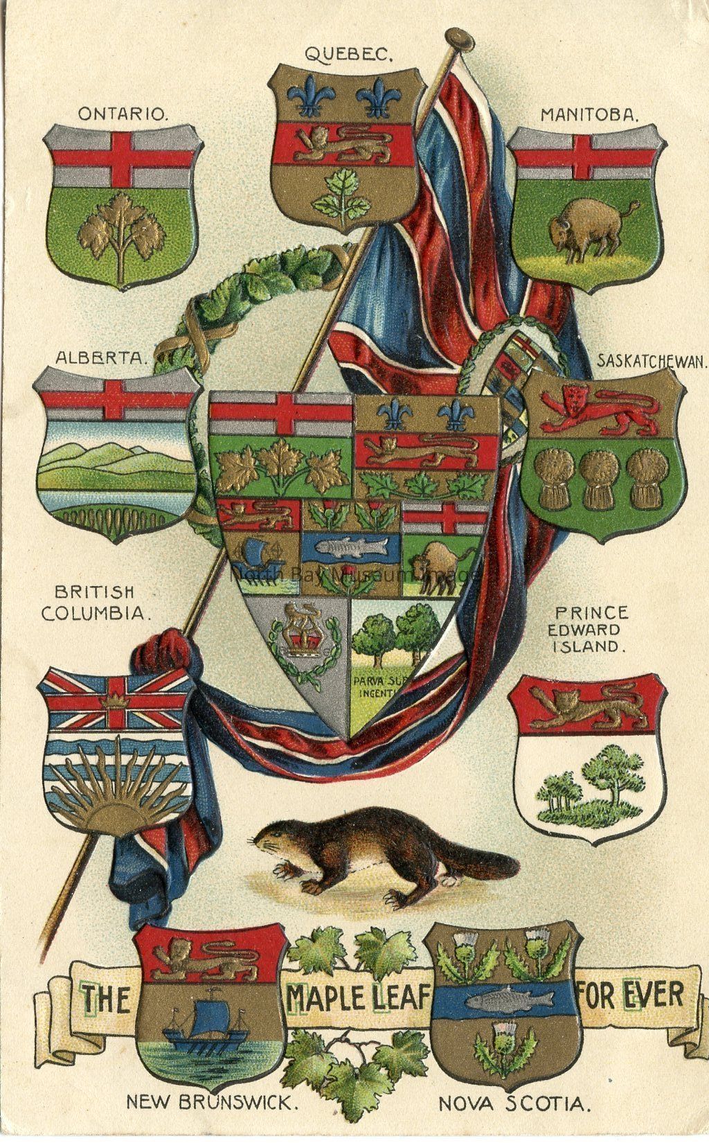 This postcard is from the The Canadian Patriotic Post Card Handbook BB4 B.B. LONDON SERIES 1290. The postcard is NO. 1290 and has a coat of Arms of Canada and nine provinces with Union Jack interdraped. The wording "The Maple Leaf For Ever " at base. There is no handwriting on back of the postcard.