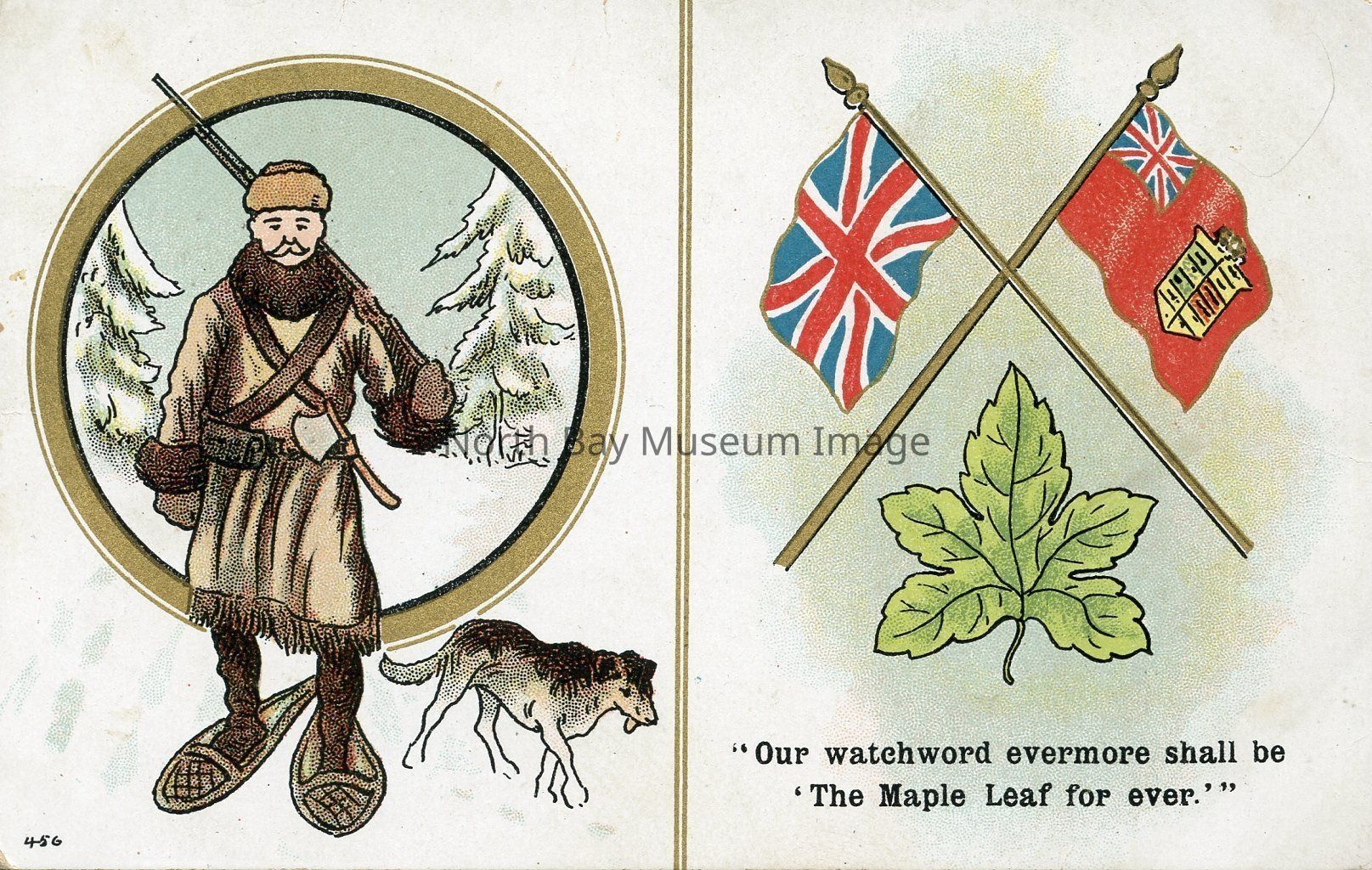 The front of this coloured postcard shows an image of a man dressed in furs snow shoeing and possibly hunting (because of his gun). There is also a wolf or a dog next to the man. On the right side of the image is an illustration of two flags crossing (one of which is the British Union Jack), and an image of a leaf. The text on the bottom right hand corner reads "Our watchword evermore shall be the Maple Leaf for ever."