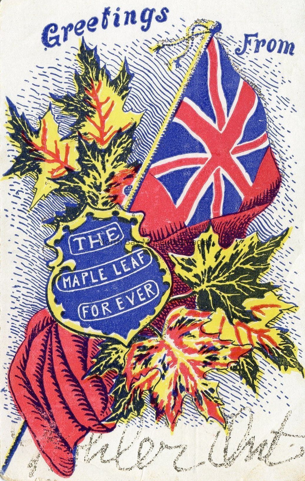 The postcard has a Canadian Red Ensign with crest "The Maple Leaf For Ever" surrounded by green & yellow maple leaves. It says Greetings from an unknown location with glitter stuck on.