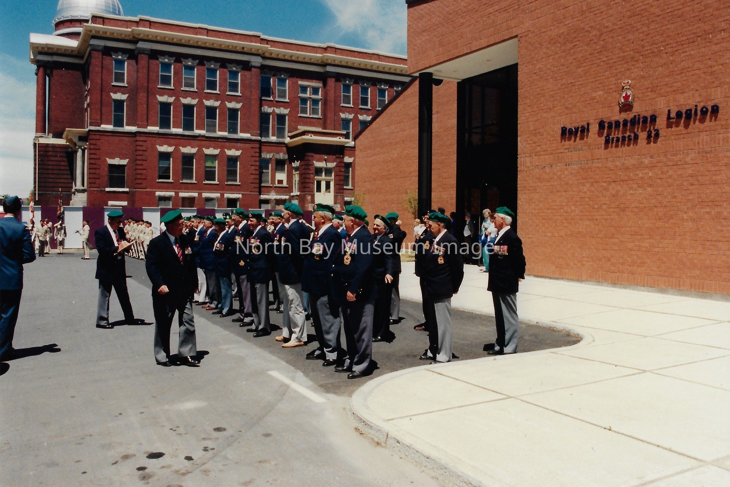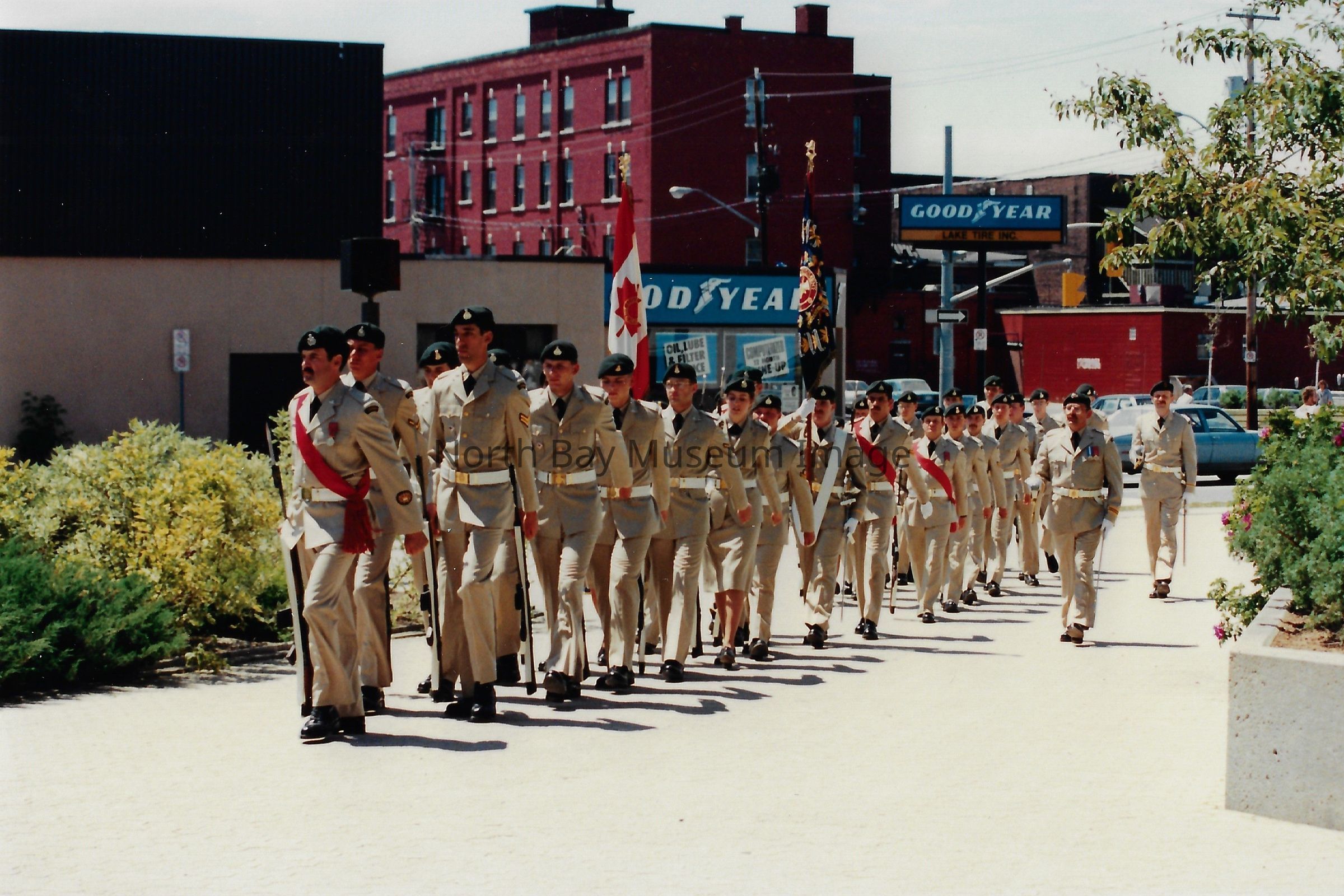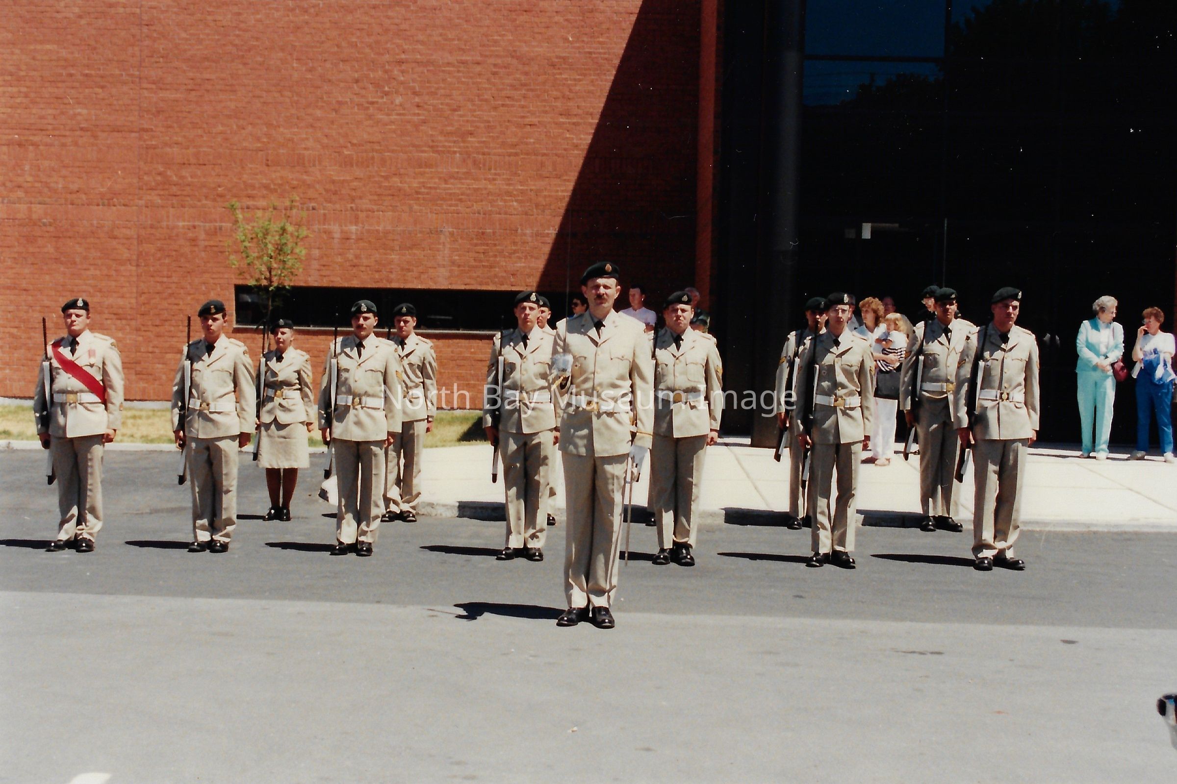 Series of photos originally in a photo envelope from S. Guindon sent to Bill Alexander from the "Presentation of Colours" ceremony which involved the formal presentation of two flags to the Algonquin Regiment in 1984.