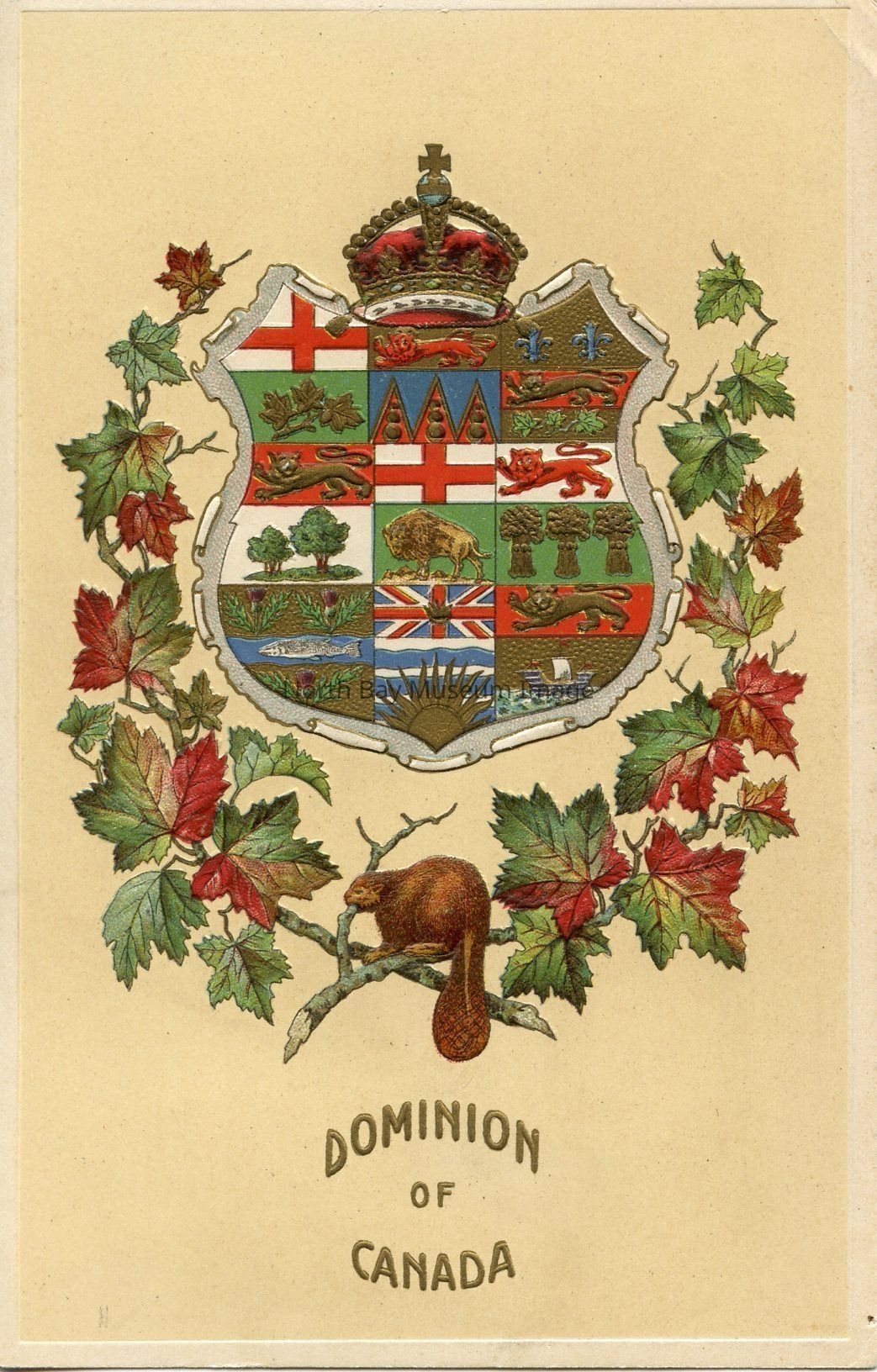 The front of the postcard has a 3 mm beige border, and a beige background. The card has Canada'S crest with a crown on top partly encircled by two branches of multi-coloured maple leaves with a beaver beneath. The text has "Dominion Of Canada written."