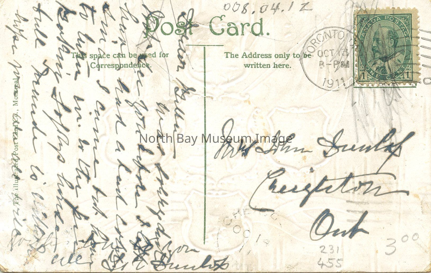 The postcard is one of a collection of 33 cards found when moving from 101 Main St. E. to CPR building