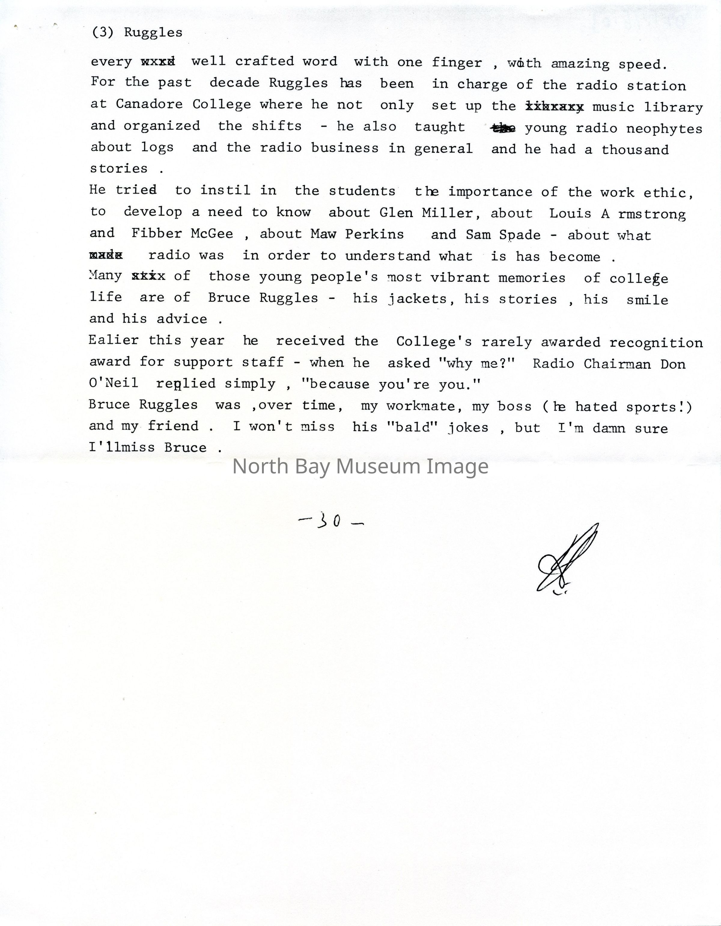 Contents include a document covering and memorialising the history of "Bruce Ruggles", and a letter from Pam Handley to Sid Tomkins expressing gratitude for "a copy of the presentation that you gave during the funeral for Bruce Ruggles". Noteworthy topics include "Bruce Ruggles", "CFCH", "Terry Spearin", "Bob Wood", "Nipissing M.P.", "Joe Torbay", "CKGN Television", "CFCH TV", "Canadore College", "radio", "Sid Tomkins".