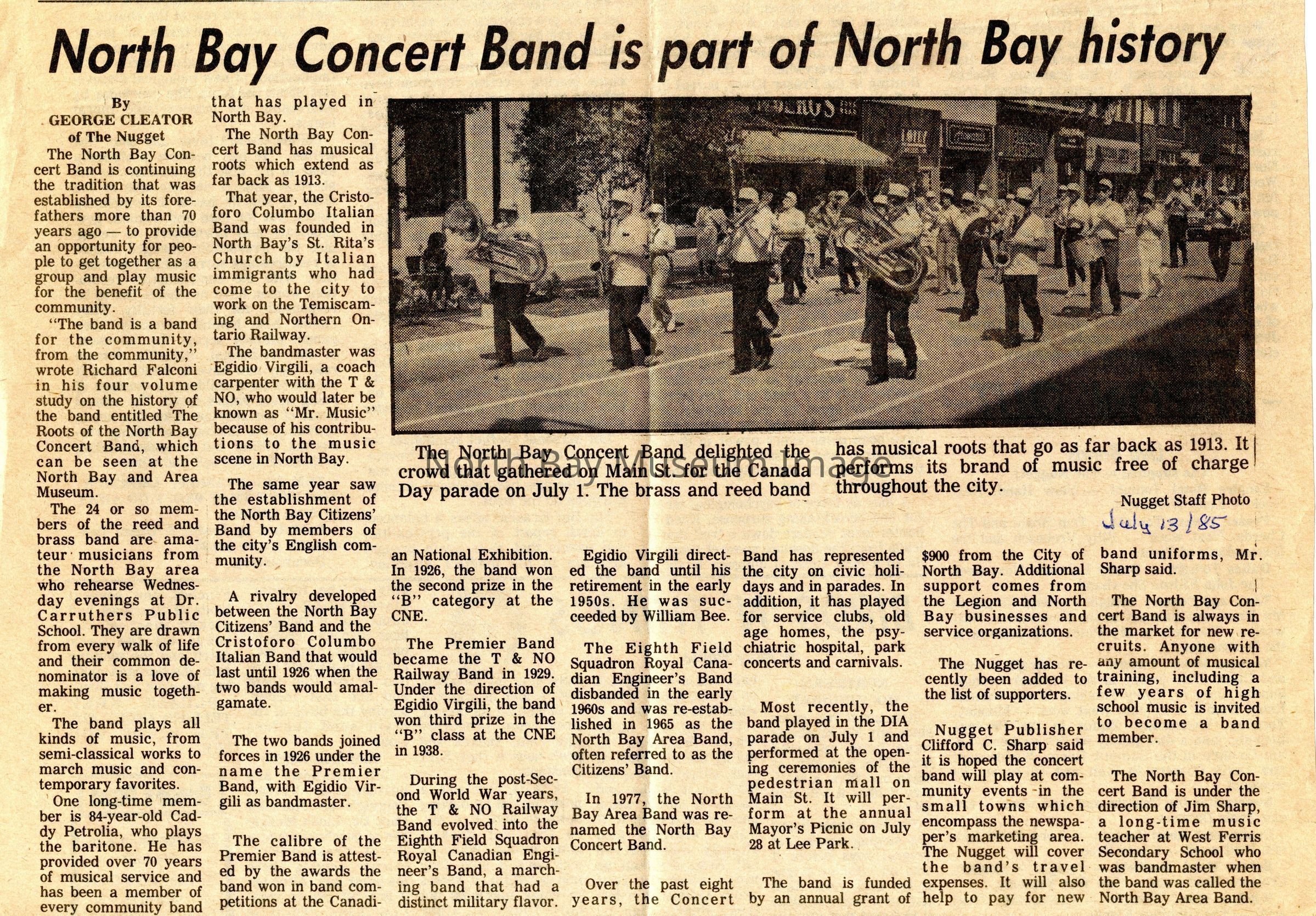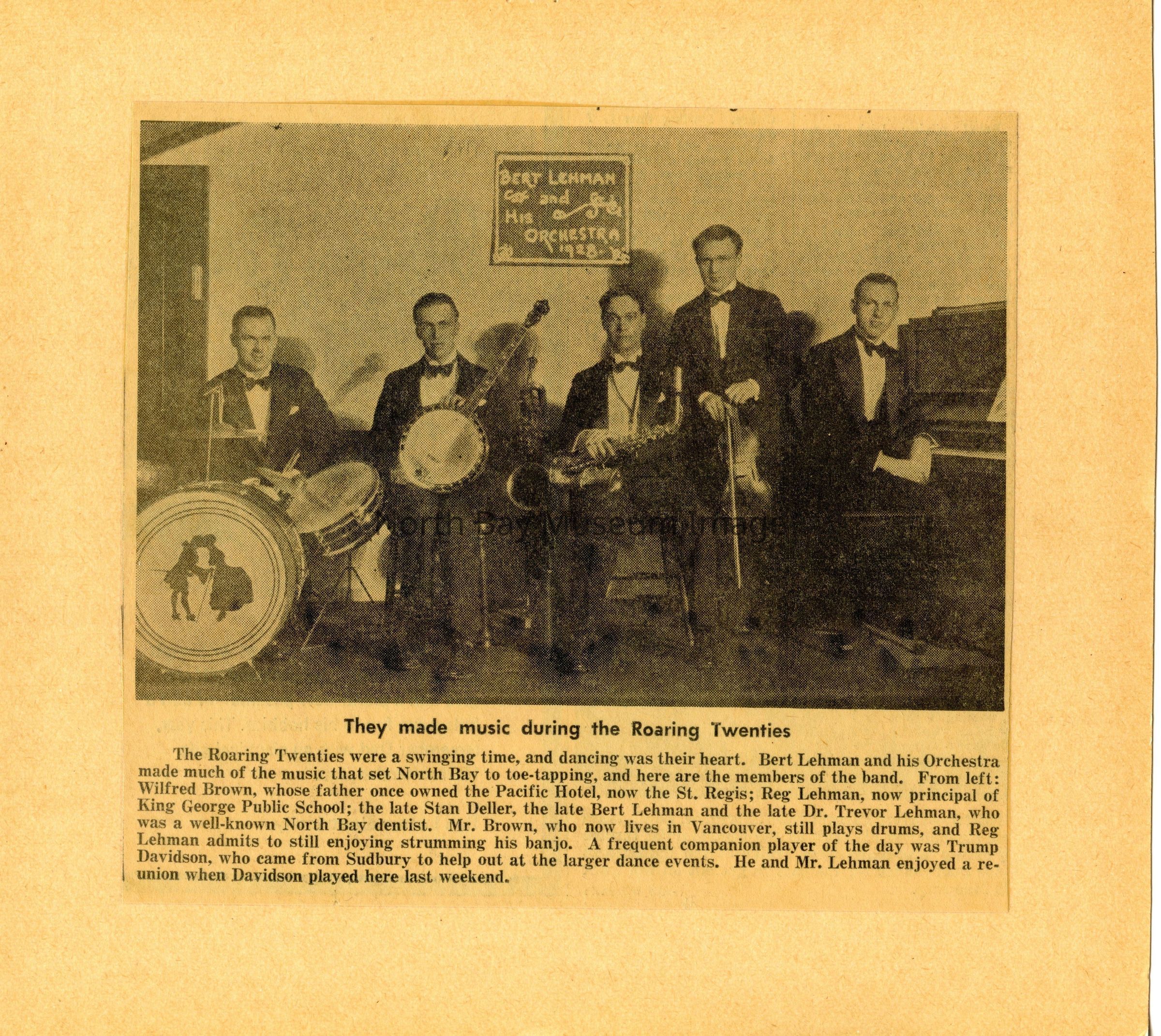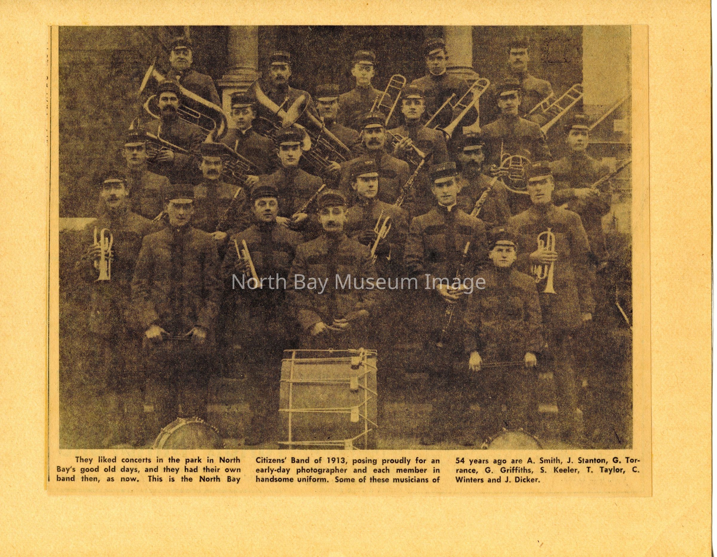 Various documents and newspaper clippings concerning bands in North Bay. Includes correspondence between Pam Handley, North Bay Museum Curator and Gerry Dyke, Centennial Public School Teacher regarding Maryann Brown's research on bands in North Bay. Brief biography of music journalists and musicians: John Size, CKAT radio and Britt Jessup, North Bay Nugget reporter and Leo Lamothe.Date(s) of Creation