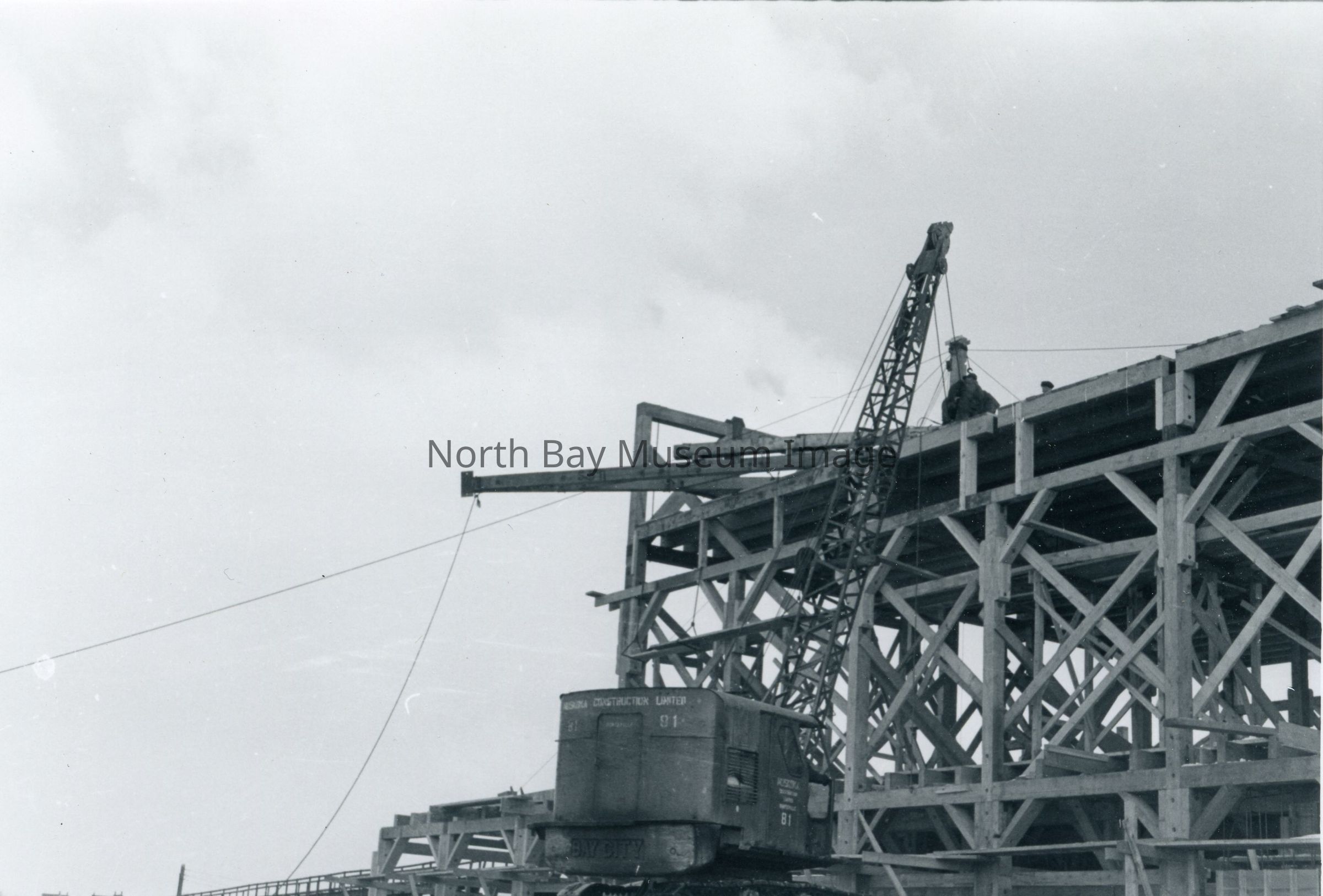 -Top of the structure with a crane lifting something. -Nothing written on border. -Black and white. -9 cm x 12.5 cm.