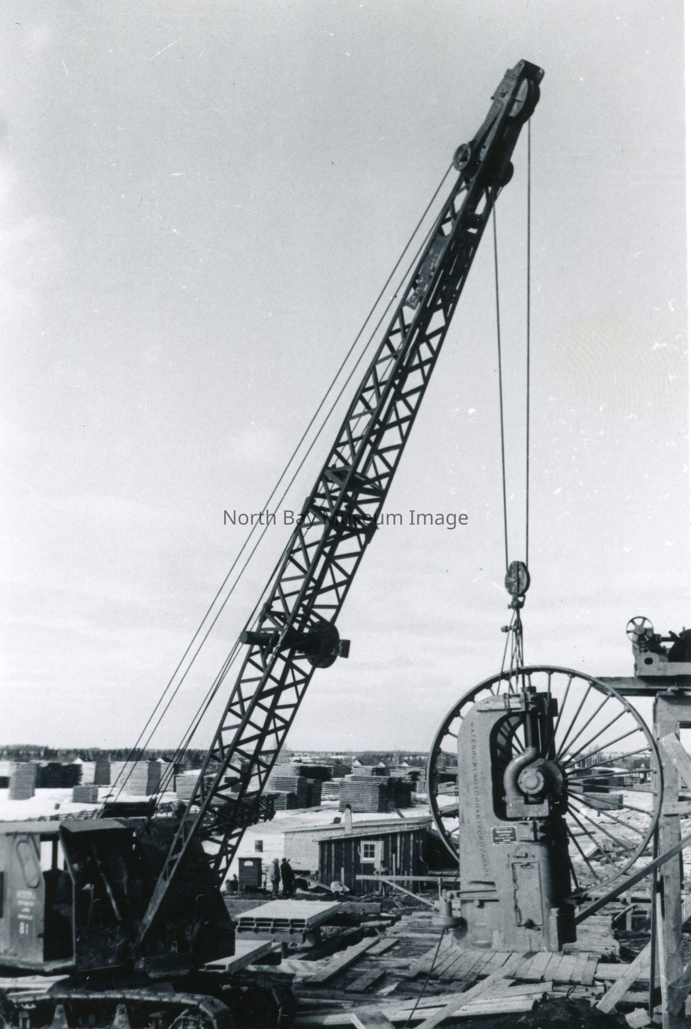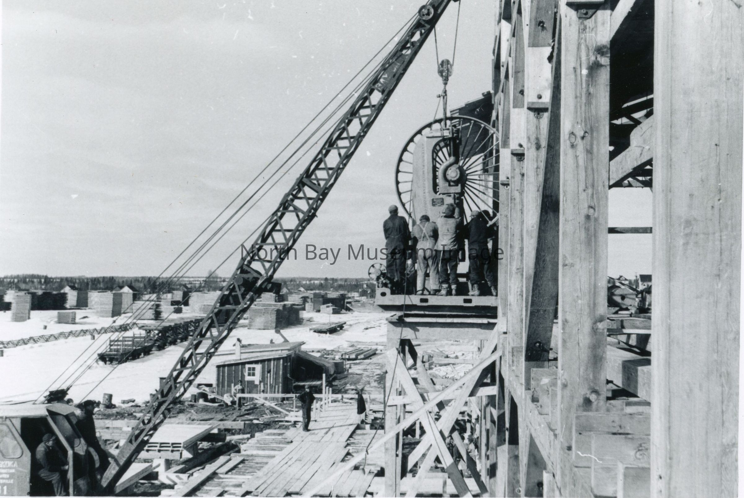 - Picture (b) shows the large piece of machinery being installed. About seven (7) men are seen.