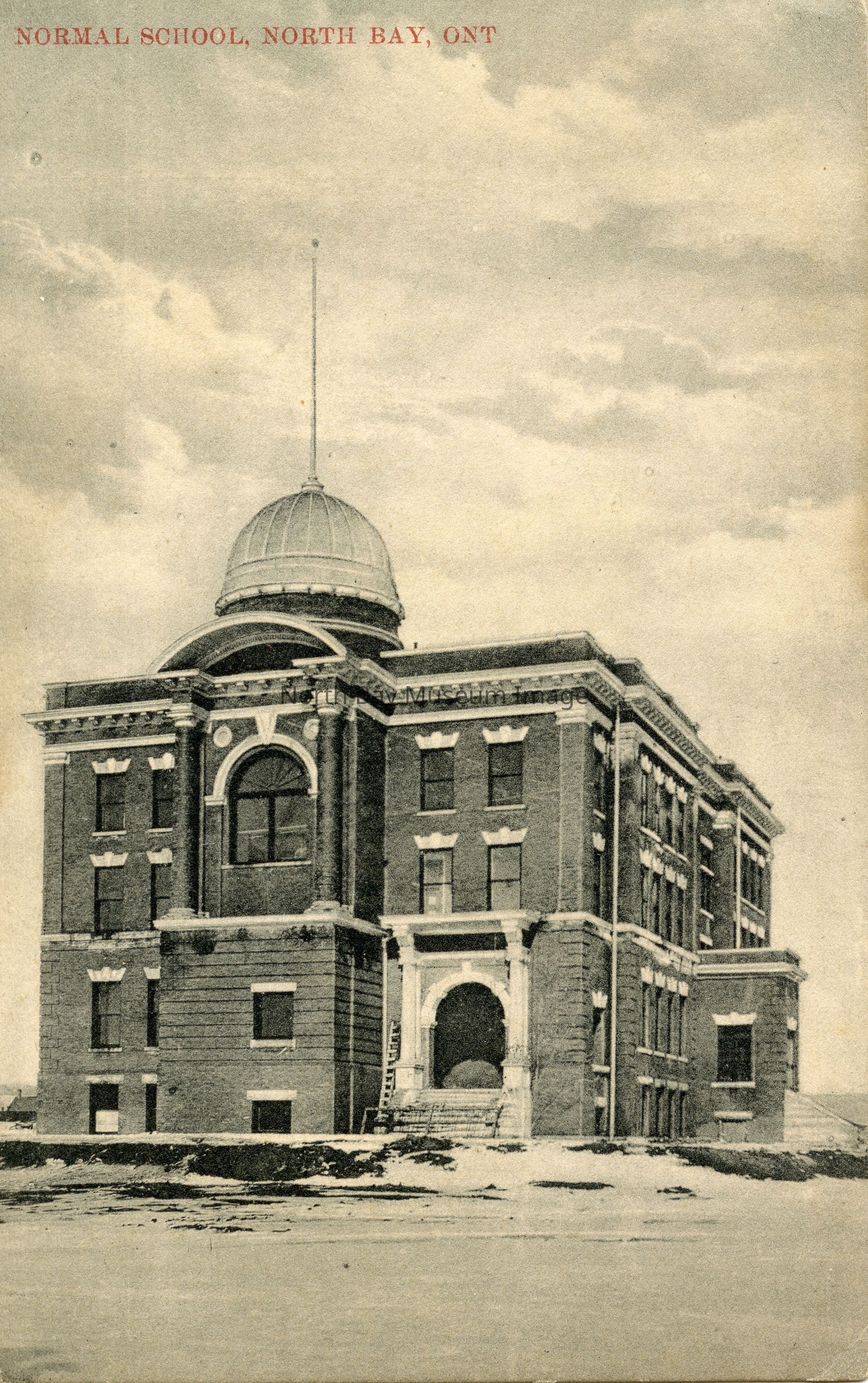 The front of the postcard is a vertical, Black and White (sepia) picture of NORMAL SCHOOL NORTH BAY. The image is taken back from the street looking straight on at the front of the Normal School. The school was built on a small hill. Note the grand windows, the grand entrance and steps to the front door, and the dome roof over the right half of the building. There appears to be snow on the ground in front of the school. "North Bay Normal School," is written on the top left hand corner in red text.