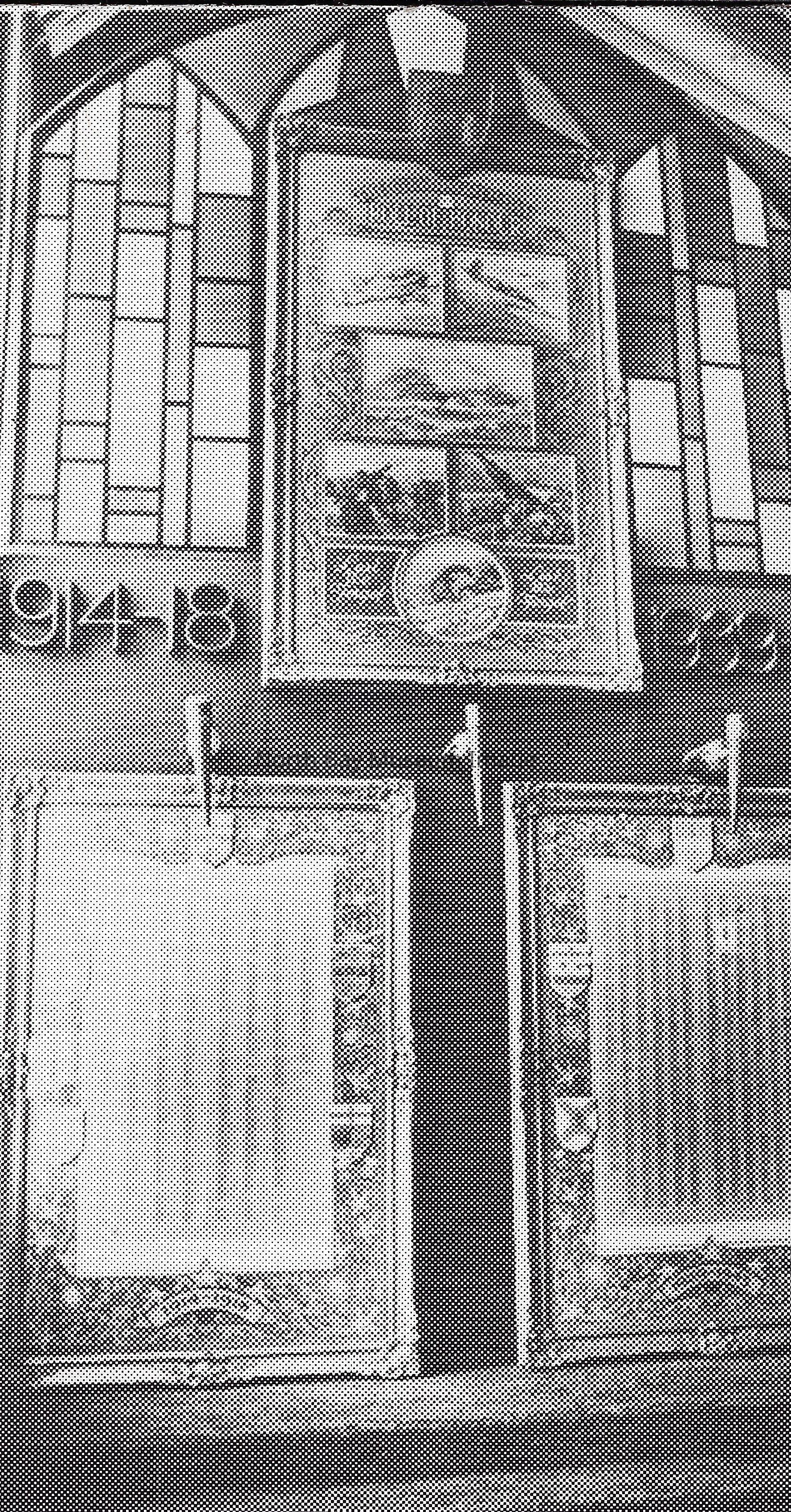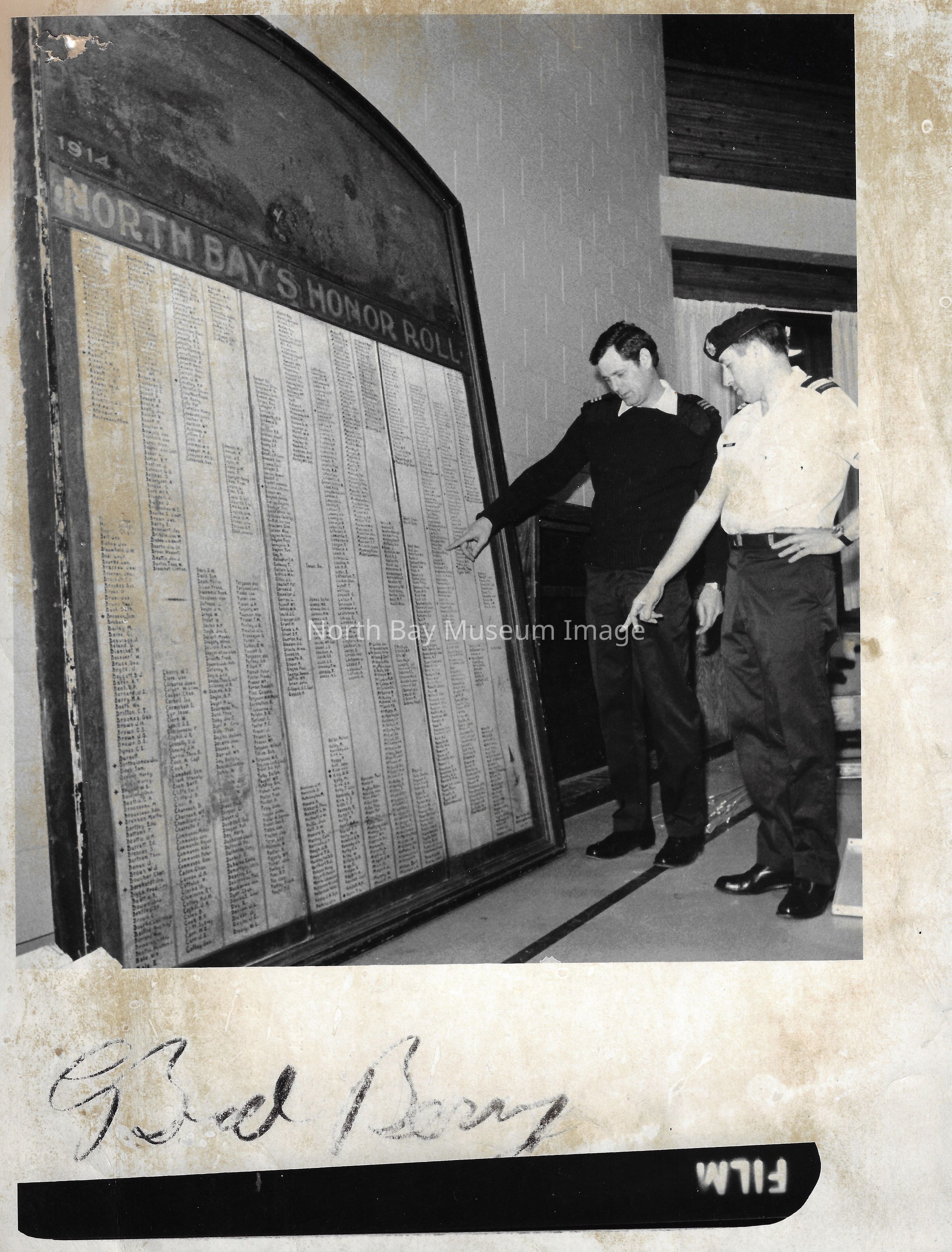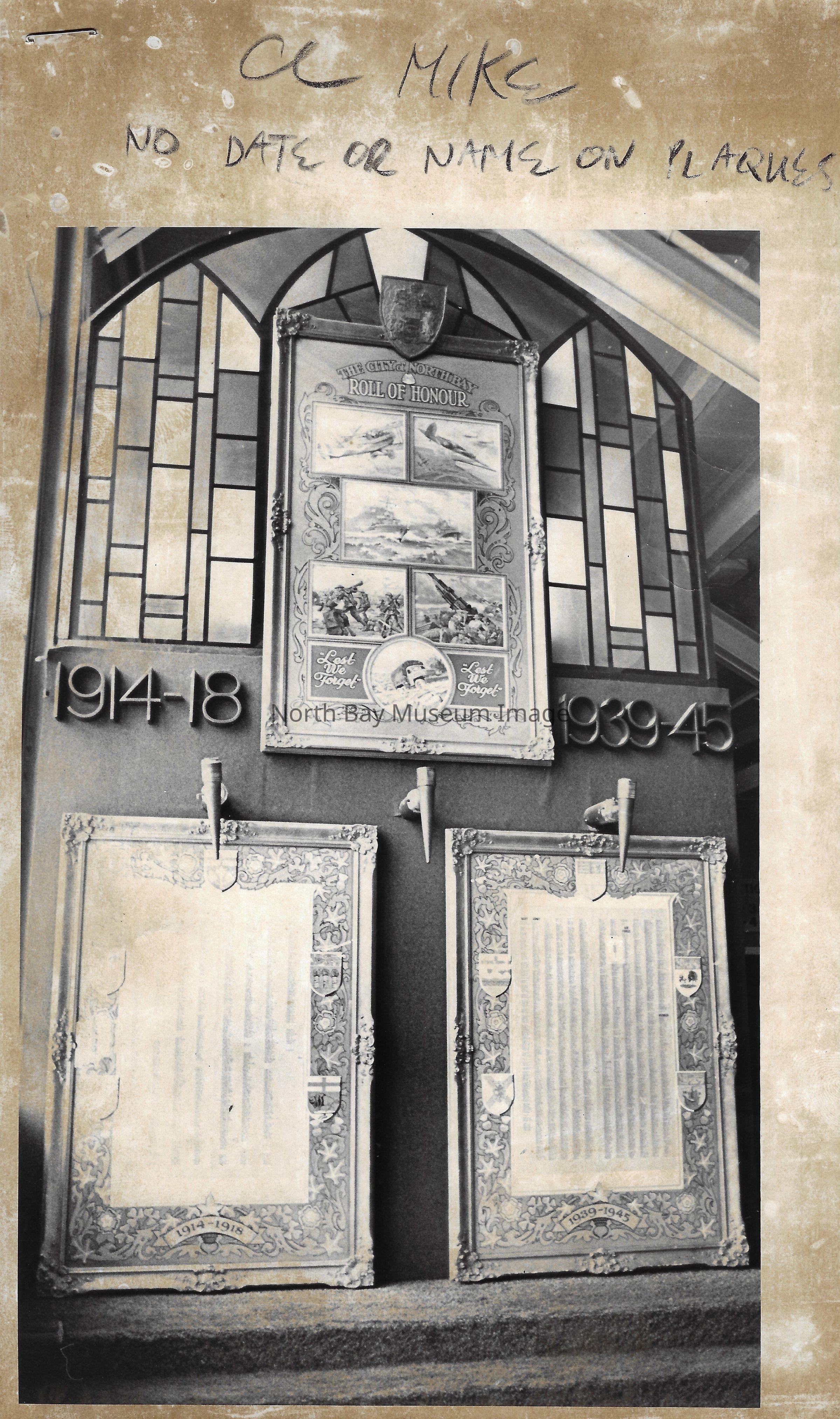 022.01.107a-b: Photos of North Bay Honor Roll Memorial plaques for WWI and WWII hung at Memorial Gardens. 022.01.107c-d: Memorial Plaque made in 1917 which isis 9' by 6'. s