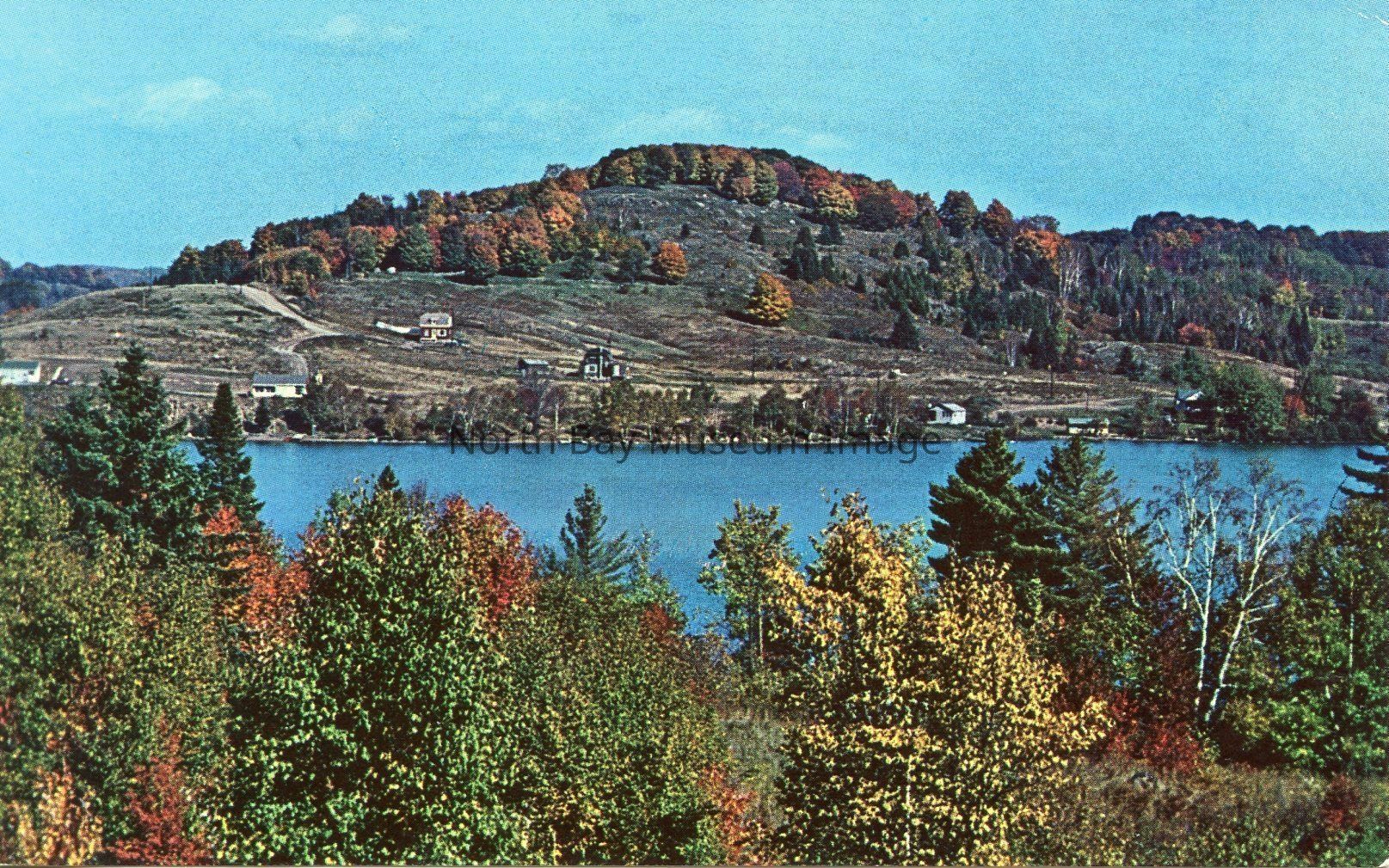 This is a coloured postcard. This is a lanscape image. The photo is taken from above looking up at a hill. In the distance where the hilly landscape is a shoreline, and a few small houses. The water appears to be calm. The sky is clear blue. The season has to be early fall or later summer as the trees are green, orange, red and yellow